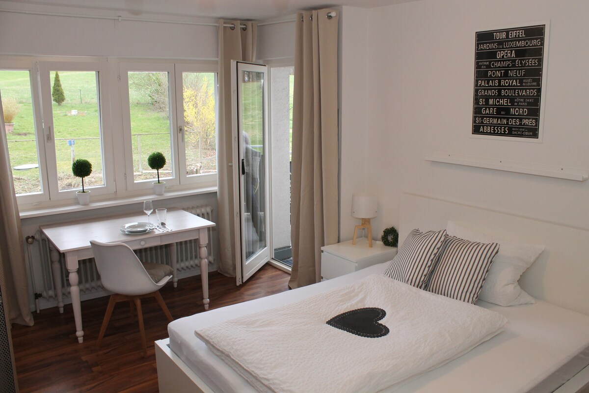 Acogedor estudio de 35 m² lleno de luz para hasta 2 personas en una zona residencial tranquila de Grenzach, ideal para estancias de trabajo en Basilea o para visitar el sur de Baden, Alsacia y Suiza. A 3 minutos del autobús a Basilea y a 5 minutos de la estación de tren de Grenzach. Aparcamiento. El estudio en el segundo planta de un bloque de apartamentos tiene un pequeño balcón con vistas al campo. Decorado de forma moderna con buenos colchones y ducha nueva. Cocina totalmente equipada con cafetera Nespresso. Wifi.