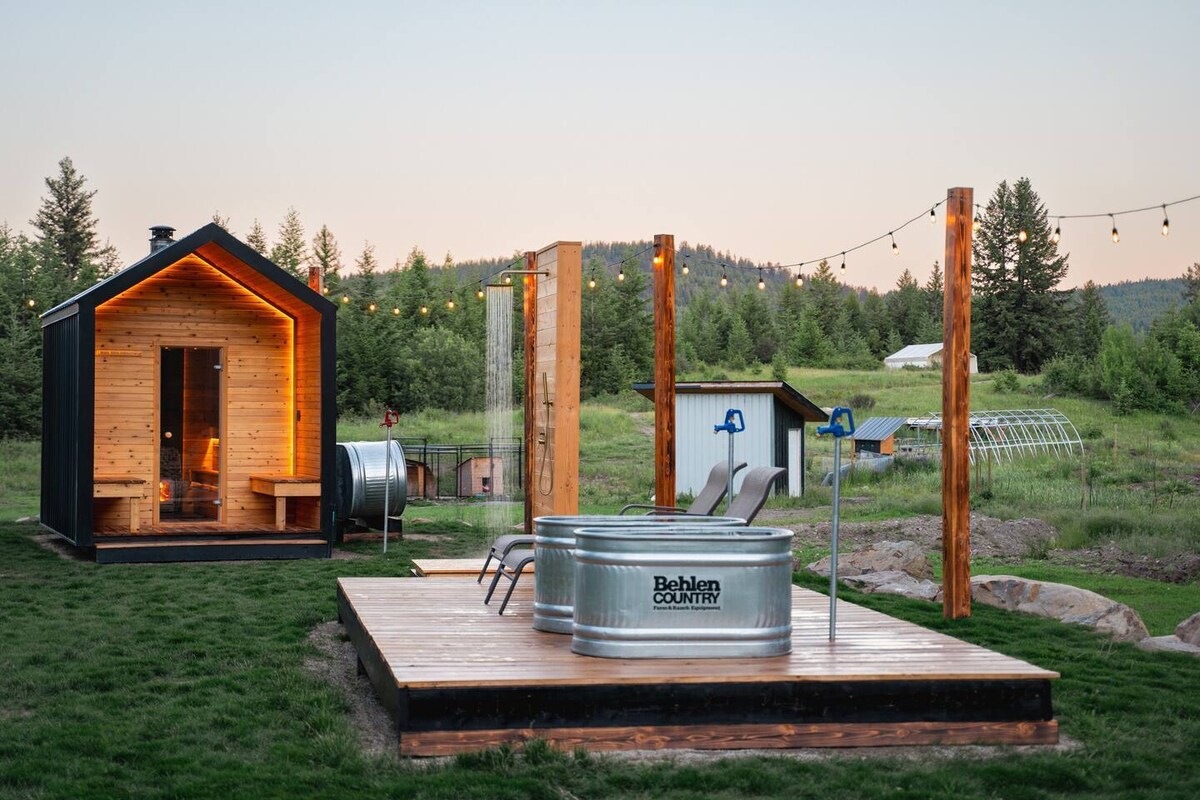 Cabaña con estructura en A + sauna, jacuzzis y piscinas de agua fría