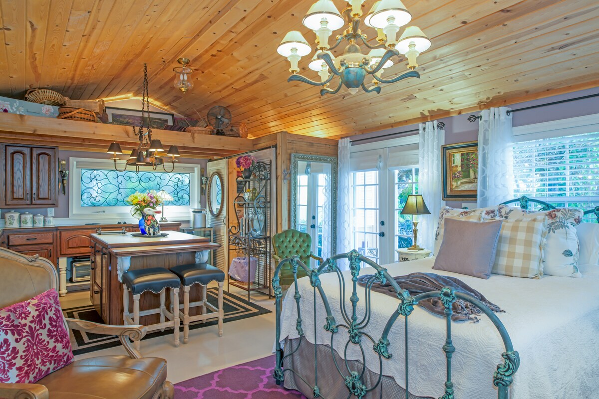 Enjoy your stay at this shady oak guesthouse. It is located on our 2 acres of land with the view of a neighboring lake. Don’t let the size fool you, it has a queen size bed, small kitchenette with fridge, microwave and coffee. The eating area can double as a workspace if needed. It has a full-size bathroom as well. It has a brand new ac and air purifier. It has outdoor seating, privacy fence and keyless entry. Minutes away from JIA, River City Marketplace, the Zoo and the Cruise terminal.
