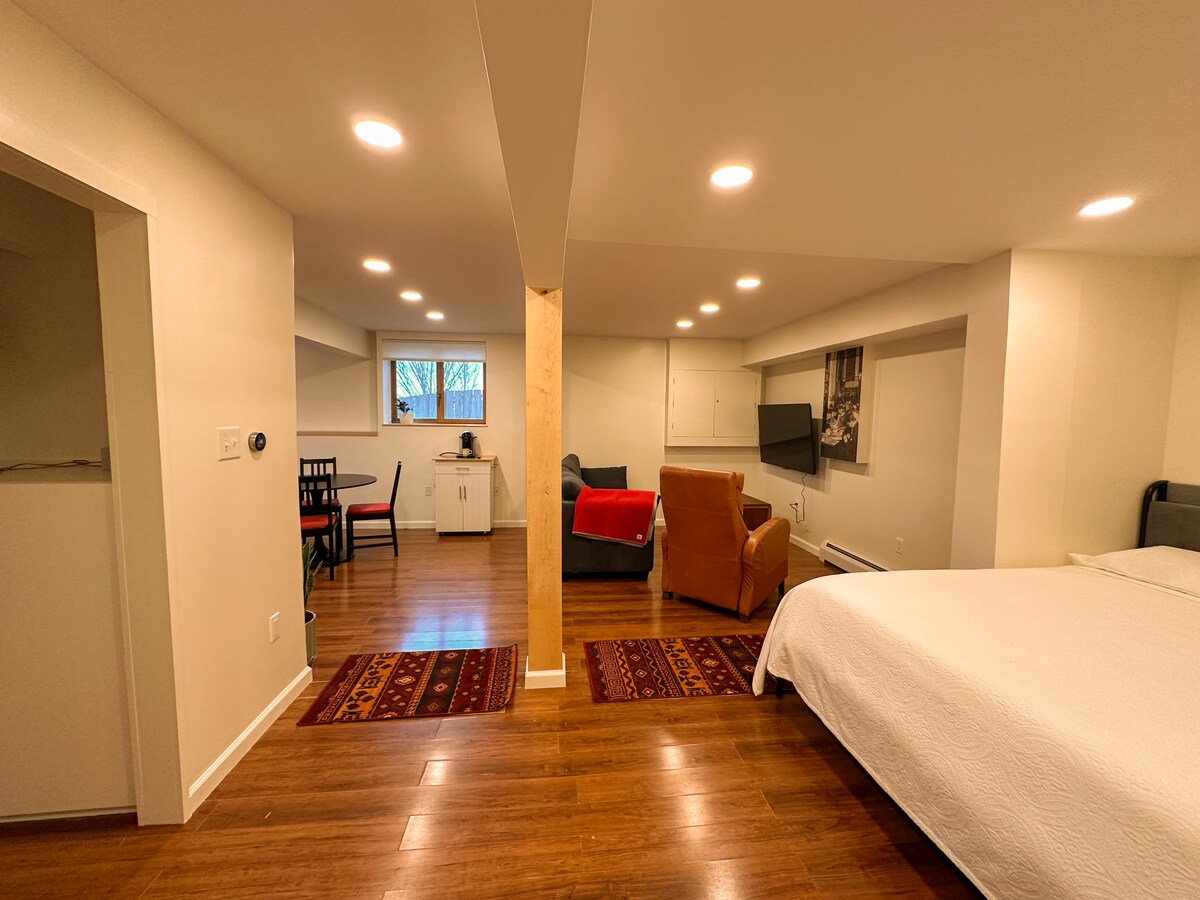 Apartamento tipo estudio, bonito, espacioso e impecable, con cocina y baño actualizados (bañera y ducha) y suelos de bambú. La cama tamaño queen está parcialmente separada de la sala de estar por un mostrador de desayuno. La sala de estar tiene 2 sofás cama. Todo el espacio tiene capacidad para 4 personas. Excelente wifi y televisión por cable. Dejaré pan, huevos, café y otros artículos de desayuno de buena calidad para que cocines. Ten en cuenta que el precio reflejará automáticamente una tarifa de 30 USD por noche por cada huésped adicional después de los 2 primeros huéspedes.
