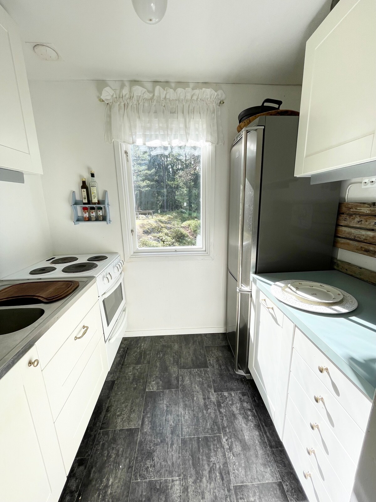 Casa de campo de nueva construcción de 30 metros cuadrados. A 5 minutos a pie del puerto. - Plano abierto con cocina y sala de estar en uno. - Loft para dormir con 2 camas individuales. - La sala de estar tiene un sofá cama. - La cocina tiene una placa de inducción y un horno. - Baño totalmente revestido de azulejos con inodoro, ducha y lavadora. - Amplia terraza alrededor de la casa con comedor. - La vista consiste en bosque de pinos y arándanos. - La limpieza NO está incluida. - NO se admiten mascotas. - Los huéspedes traen su propia ropa de cama y toallas (se pueden alquilar por 150 coronas suecas por persona)