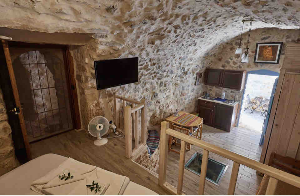 Cueva tradicional restaurada con respeto a la historia y la arquitectura de Mani. La suite de 400 años de antigüedad ofrece a los huéspedes una experiencia única, combinando la autenticidad de la cueva con las comodidades modernas. El edificio está construido completamente en piedra en el estilo tradicional de Mani. En el interior, encontrarás una auténtica excavación en la roca, iluminada discretamente, que se descubrió y se destacó durante la cuidadosa restauración del espacio.