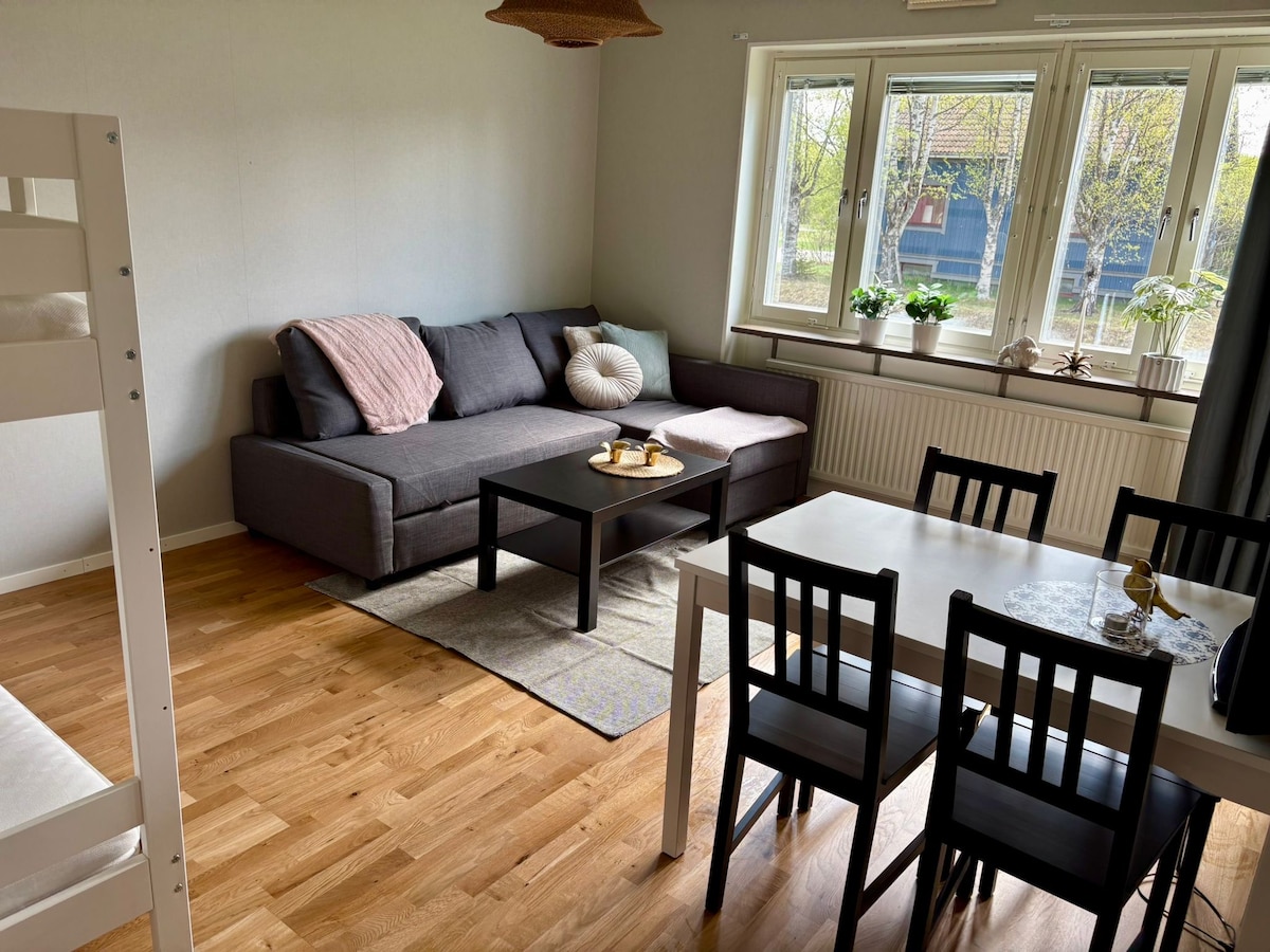 Apartamento más pequeño en el sótano con una pequeña cocina americana. El departamento tiene una cama de 105 cm y un sofá cama más pequeño que se pliega al mismo ancho (105 cm). Hay sábanas y toallas in situ. Hay estacionamiento en la calle fuera de la casa. El alojamiento se encuentra a unos 3 minutos en auto de la E4. El centro de la ciudad está a unos 1,5 km.