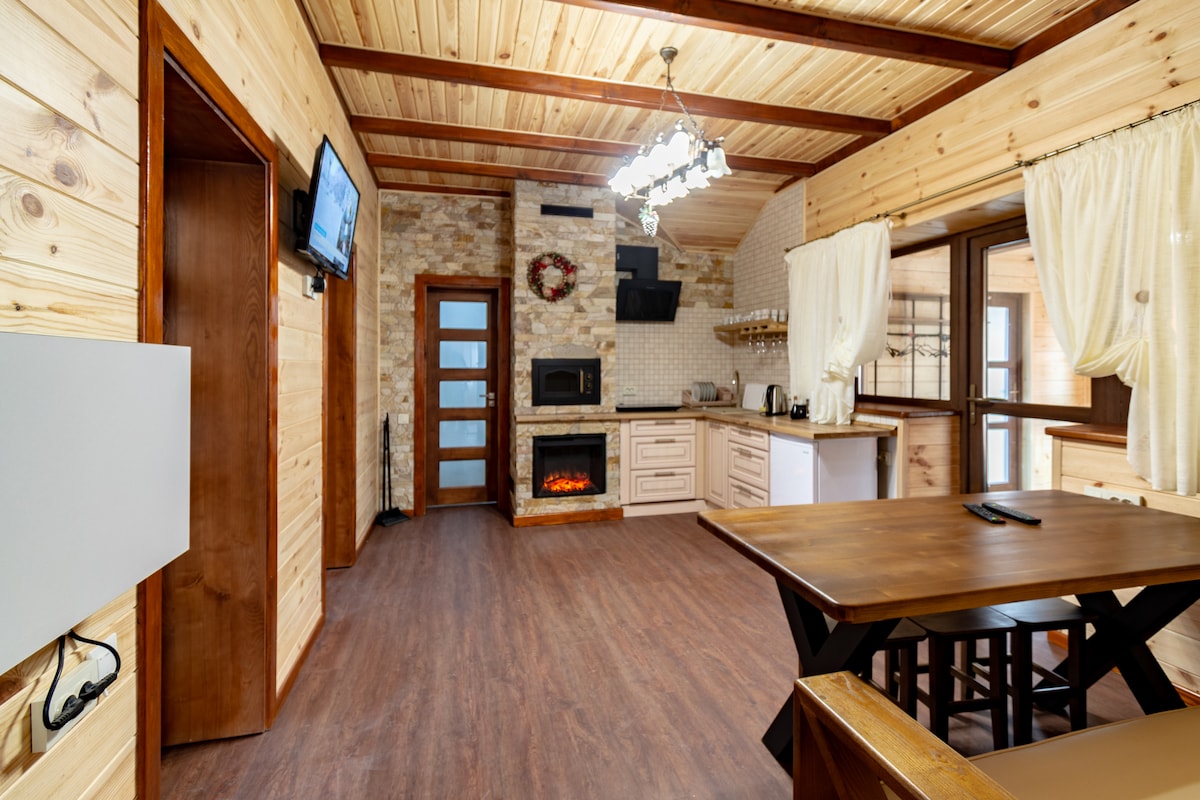 Le ofreceremos maravillosas cabañas de madera con todas las comodidades en la famosa estación de esquí Oryavchik-Zvenyiv. Amplia zona y terraza con brasero. Las casas de huéspedes se encuentran cerca del bosque, a 4 km de las excavaciones de Zveniv. El río Oryavchyk fluye a través del territorio del sitio. Las habitaciones dan al río, a una antigua campana del siglo XVIII y a las montañas circundantes.