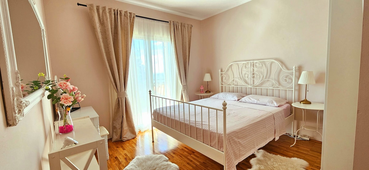 Apartamento de 65 metros cuadrados y terraza de 35 metros cuadrados. Dormitorio con 1 cama tamaño king y baño privado. Amplio salón con 1 sofá cama doble y otro sofá, pequeña cocina totalmente equipada. Amplia terraza con vistas exclusivas al mar y a la ciudad. A 5 minutos en coche del centro y a 10 minutos de la playa. Aparcamiento gratuito. La casa está rodeada por un hermoso parque privado y la zona es tranquila. Wifi gratuito. Todo el espacio es privado para el huésped. Wifi. Tenemos Netflix y Eurosport.
