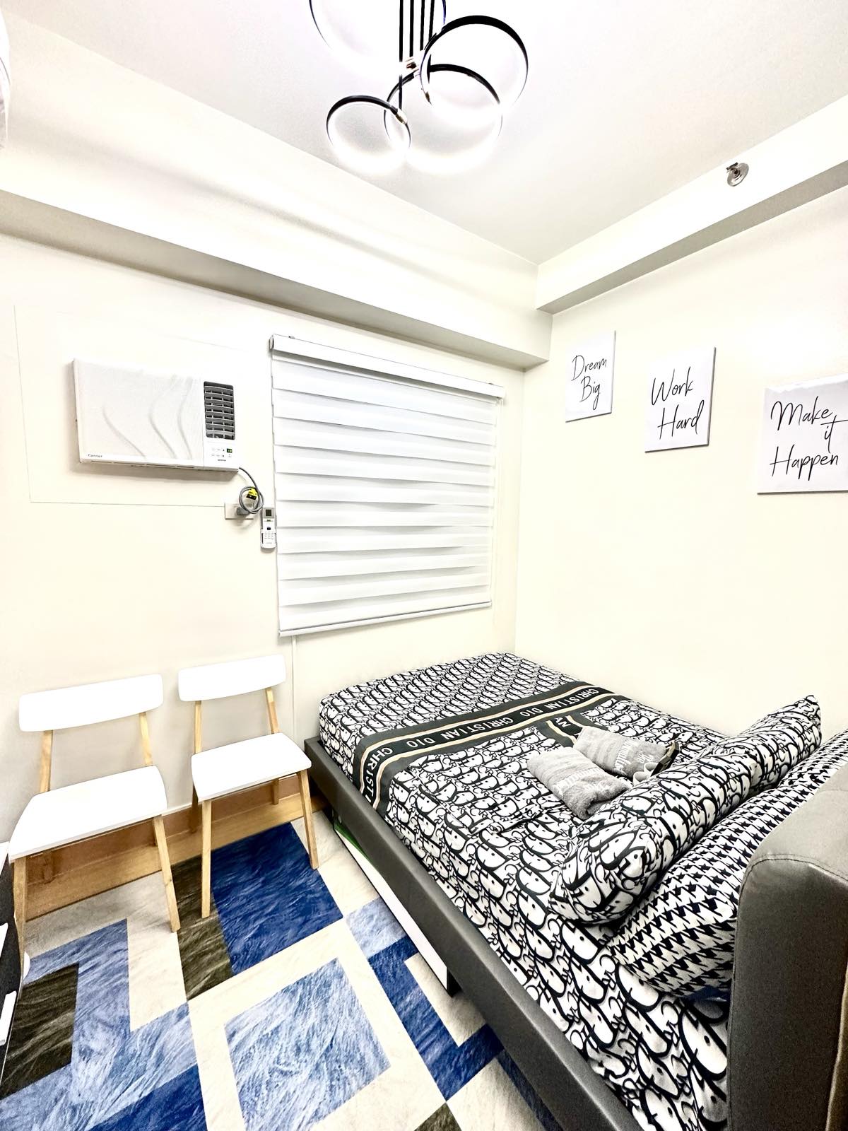 Grass Residences Tower 5 41st floor 1 bedroom with balcony City lights view Check in: 2pm onwards Check out: before 12nn 🛏️ Queen Size Bed 🛏️ Double Size Airbed 📺65" Smart TV with Cable and Netflix 🛋️Sofa 🍽️Dinning table and chairs 🛜100mbps fast internet connection ❄️1.5hp split type aircon 🧑🍳Complete cookwares 🥶2Door Refrigerator ✅Microwave ✅Electric Kettle ✅Rice Cooker ✅Electric Stove ✅Rangehood 🚿Shower Heater 🪞Vanity mirror 🗄️Cabinet Pool ticket 150/head 7am-10pm