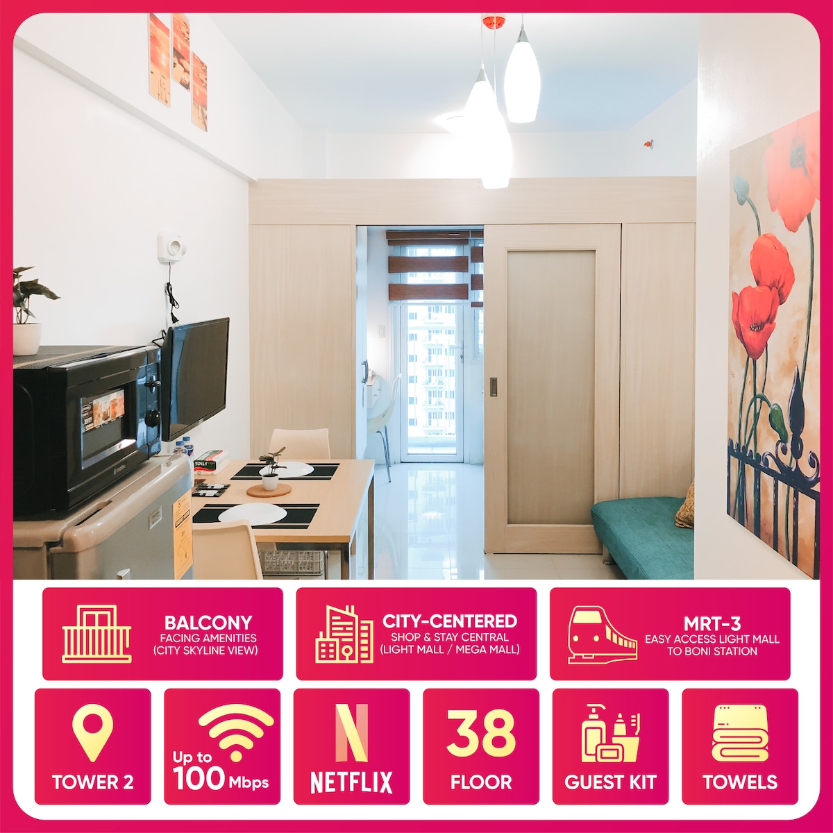 La unidad está renovada para fines de Airbnb. Aire acondicionado inverter/televisión inteligente/microondas/nevera/calentador de ducha/torre 1/servicios orientados/sol de la mañana/con balcón Debido a los estrictos protocolos de SM Light, Cada huésped debe proporcionar 1 documento de identificación válido (proporcionar al hacer la reserva) para fines de registro. También ten en cuenta que todos los huéspedes NO PUEDEN tener visitantes por seguridad según el administrador del edificio (política estricta del edificio).