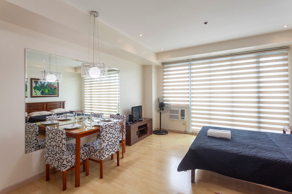 Reserva esta lujosa estancia en el centro de BGC. Todo está a solo unos pasos. Oficinas de primera calidad y centros comerciales de alta gama rodean Uptown Parksuites. Disfruta de una escapada cosmopolita en el centro comercial Uptown. Descubre conceptos únicos de comida y compras. Diviértete toda la noche en bares de primer nivel a la vuelta de la esquina. Relájate en nuestra unidad de dormitorio de mediados de siglo. Relájate en una cama tamaño queen y un sofá cama adicional. Las comodidades incluyen un televisor inteligente de 55 pulgadas, internet de 400 MBPS, zona de estudio y balcón privado.