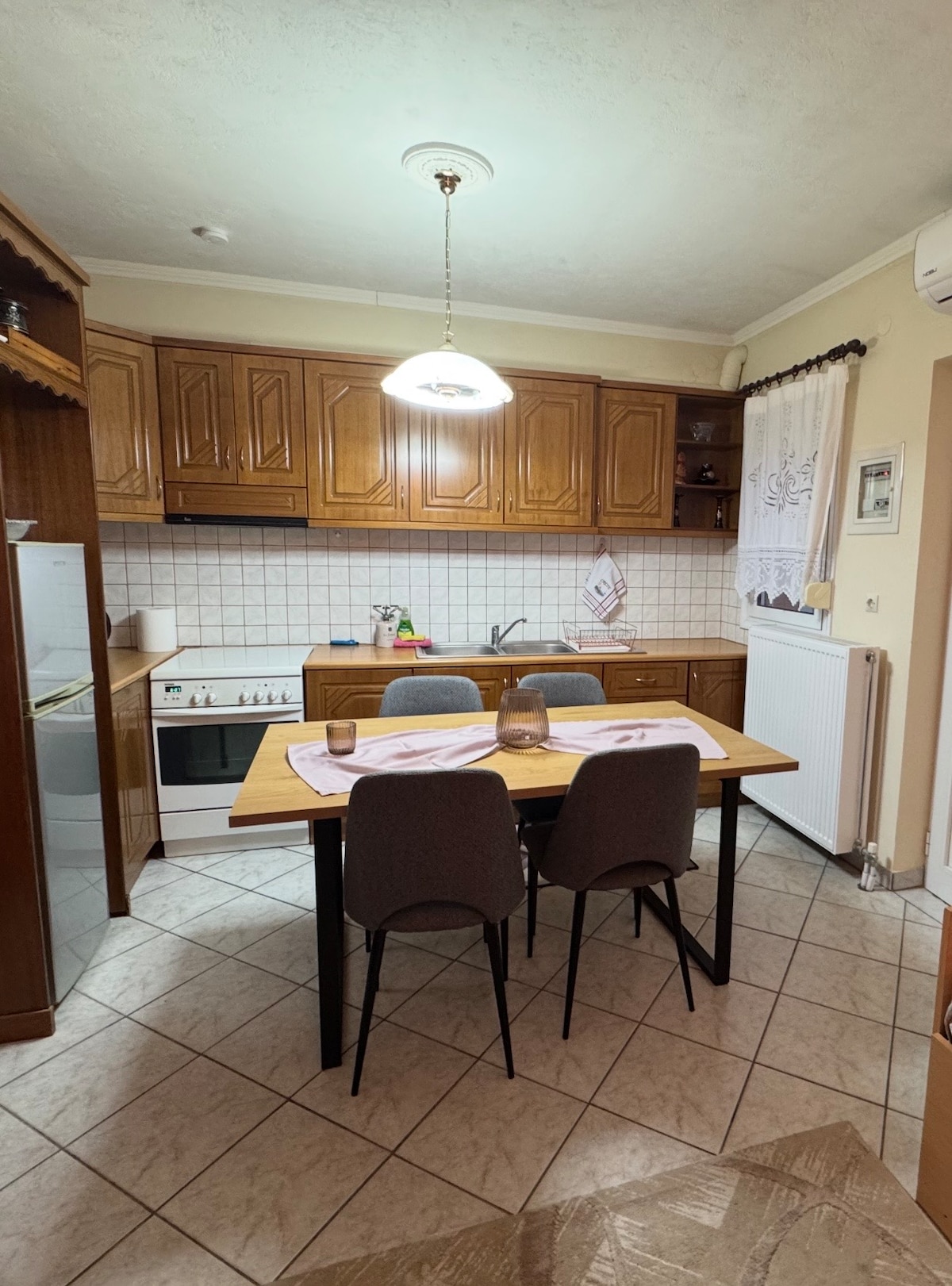 This stylish and sunny apartment of 100m2 is situated in the Old town of Kalampaka. It is located in a beautiful scenery surrounded by trees with a breathtaking terrace view of the famous Rocks of Meteora!By staying here you have great access to Kalampaka's shopping area (restaurants, bakery shops,coffee shops, banks, post office etc.) as it is only 5 minutes away from the town's center. It is in a quiet neighbourhood convenient for reaching out the best spots of Kalampaka even exploring Meteora on foot! The key position, the professional cleaning and the elegant decoration makes it suitable for every guest.
