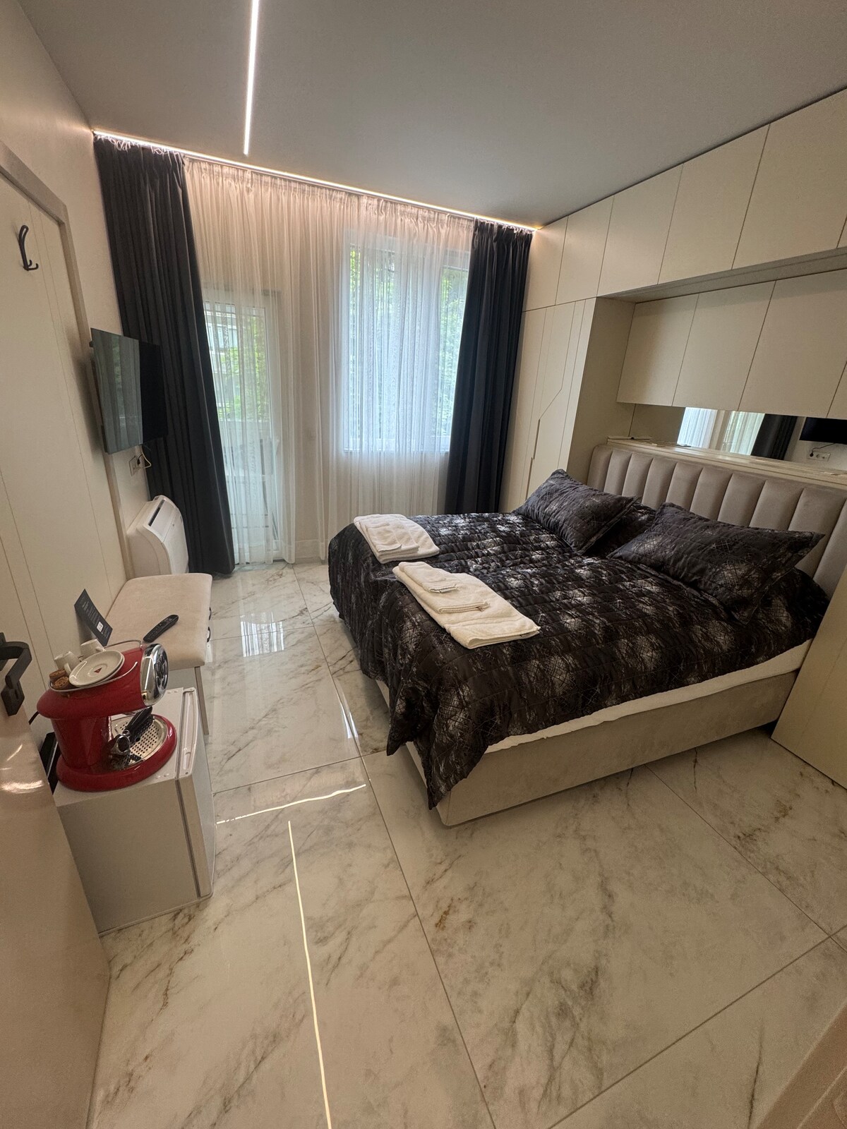 B(11) Smart & Modern Apartment welcomes you right in the heart of Sofia! Just steps away from the best-known tourist attractions and great places to be! We personally designed and implemented every single detail of this naturally bright corner suite, so you can feel here like at home. Relax and enjoy our comfortable bed, deluxe amenities and best selection of coffee&tea. Safe underground parking slot is at your exclusive disposal. Easy-going self check-in and check-out for a hassle-free stay.