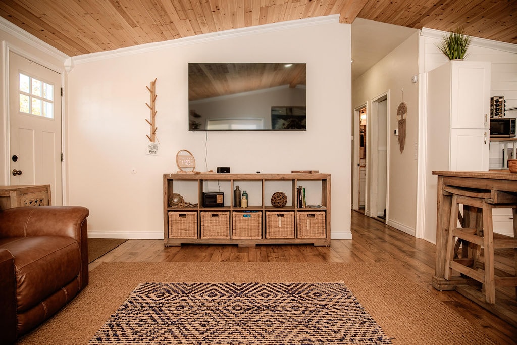 Welcome to The Rustic Retreat This rustic cabin housed a family of 5 the first 4 years of developing the property that we continue working on. This space has a fully functioning kitchen, one private bedroom,and a twin bed in the loft. The bathroom is a European style wet bath with plenty of space to shower. We are situated in a prime location minutes to town on 5 acres. The tiny house and main house are roughly 100 feet apart and surrounded by tall trees.