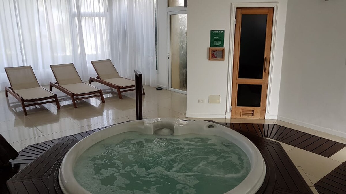 Hermoso apartamento para disfrutar en familia en Complejo Solanas, Green Park. MAYO Y JUNIO NO HAY SERVICIOS EN EL COMPLEJO (no piscinas, gimnasio, sauna, canchas, etc. solo tv cable y wifi) Monoambiente para 4 personas compuesto de cama matrimonial, y sofá cama para dos personas. Baño y cocina completos. Piscina, sauna, spa, gimnasio en el complejo. Rincón infantil. Servicio de piscina y playa, con toallas, reposera, etc. Servicio de habitación diaria, con recambio de toallas y sábanas.