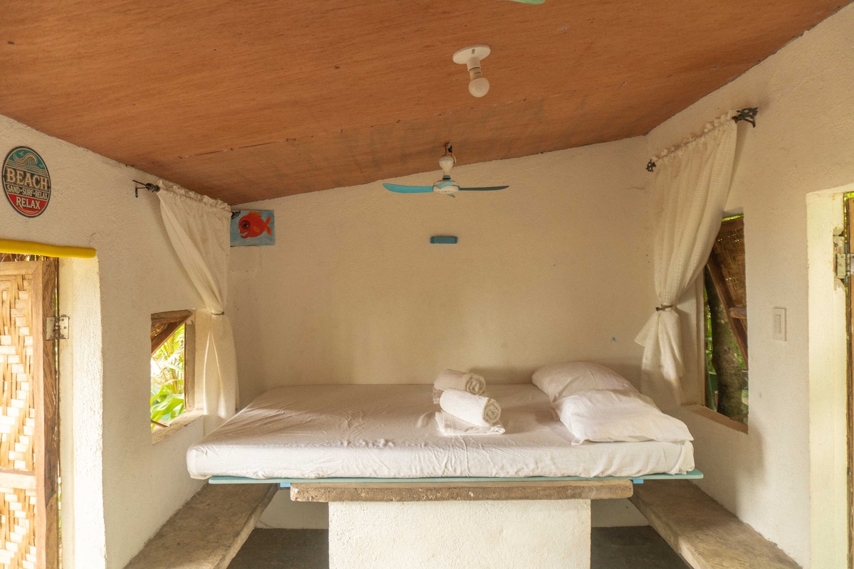 Cabaña flexible frente a la playa en Buenavista, Gubat, Sorsogon justo en la arena para la máxima relajación. ¡Es la opción más económica de la ciudad! La estructura de hormigón resistente, con Sawali tejido local para el aislamiento, se mantiene ventilada y fresca con los ventiladores proporcionados. Dos mesas de hormigón se pliegan en 2 camas dobles, con capacidad para 4 personas, rodeadas de bancos incorporados para descansar. Enchufes eléctricos junto a las camas, además de toallas y sábanas incluidas. 3 baños e inodoros compartidos. ¡Un lugar encantador y asequible!