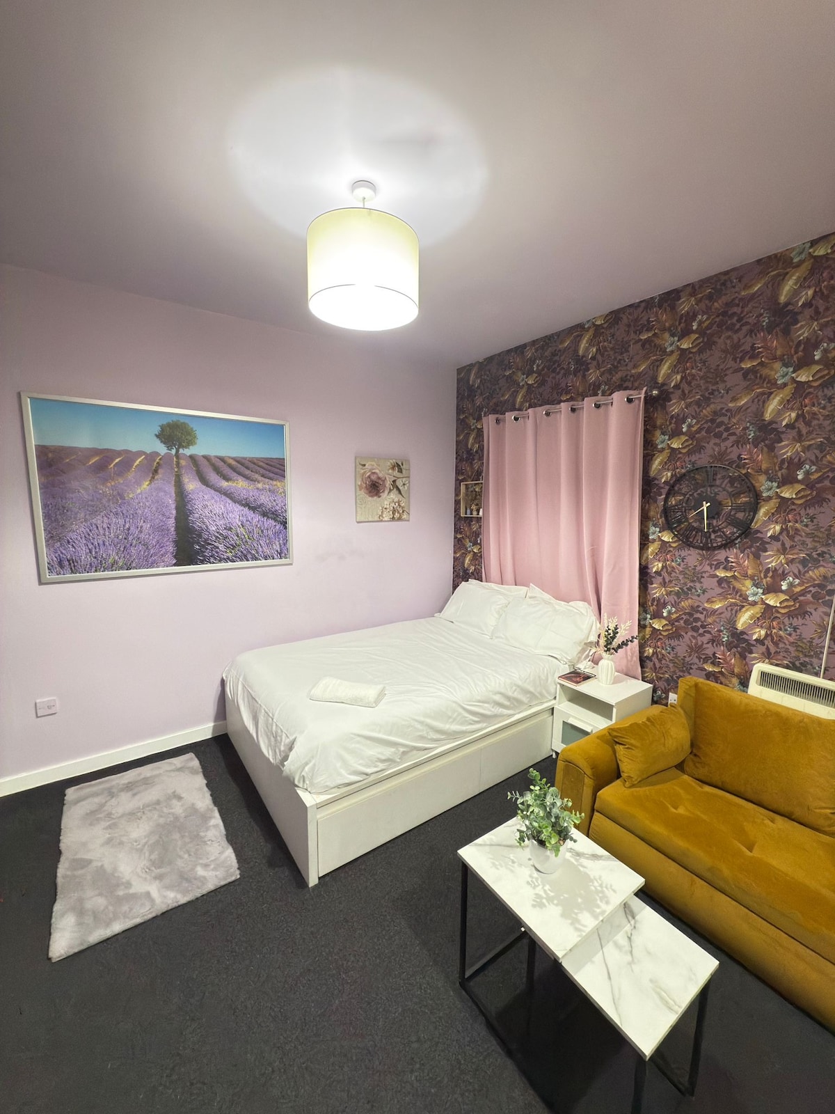 Arte 🎨 local en todas partes: paredes adornadas con fotografías de artistas de Bedford Ubicación 📍 privilegiada: a 3 minutos de la estación de autobuses, a 5 minutos de High Street 🛏 3 habitaciones únicas: dormitorio Japandi, dormitorio mágico y habitación de caja adicional, duermen hasta 6 Listo para el📺 entretenimiento: televisores en todas las habitaciones, Netflix Cocina 🍳 totalmente equipada: barra de desayuno, café, té, refrescos, agua y golosinas incluidos. Estacionamiento 🚗 gratuito, CTTV y Wi-Fi rápido siempre incluidos en tu estancia Comodidad 🚿 moderna: ducha a ras de suelo grande y extras bien pensados