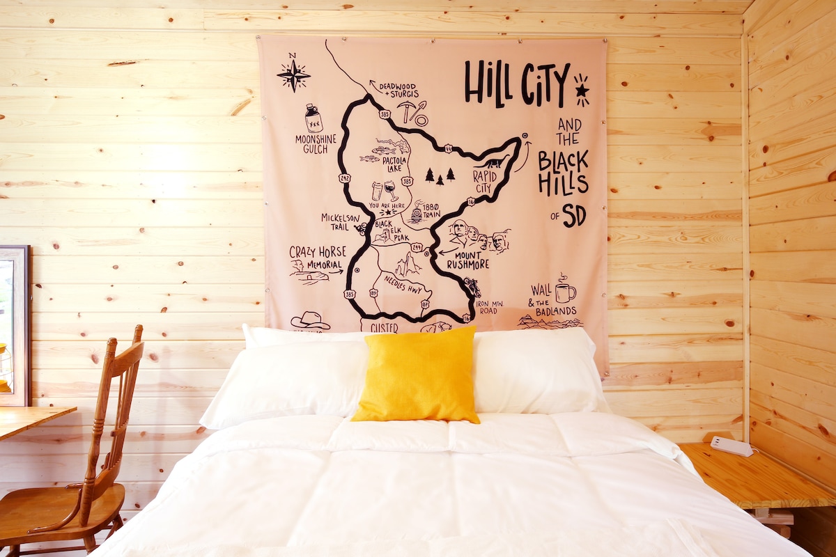 Before there were tiny houses, there were bunkhouses. This is a one room cabin style space with the bath providing a partial wall separating the bunks and kitchen. The western touches and wood ceiling in this tiny bunkhouse create a cozy getaway. It is the perfect stop and stay while exploring the Badlands National park .