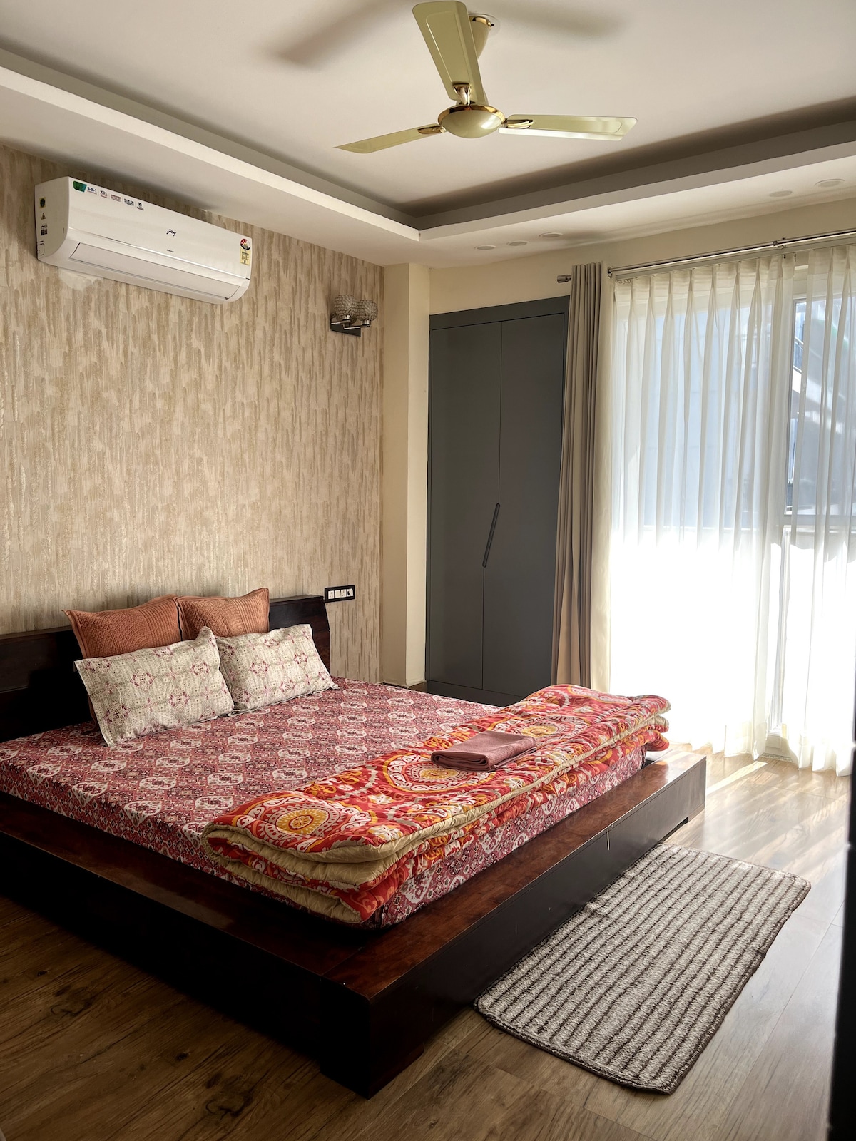 La mejor ubicación aérea vista verde habitación privada con baño adjunto y acristalamiento privado adicional que se abre a la terraza ..2 líneas de metro a 500 metros de distancia. La habitación tiene interiores de madera de diseño . Ropa de cama en el piso para huéspedes @ Rs500 adicionales. La habitación tiene iluminación ambiental interior e instalación de TV/ wifi y terraza al aire libre en el jardín y estudio. Limpieza de habitaciones y lavado de ropa adicional @ Rs 100 por día. La llegada cobra 300 por día a pagar en el momento del registro en el momento del uso.
