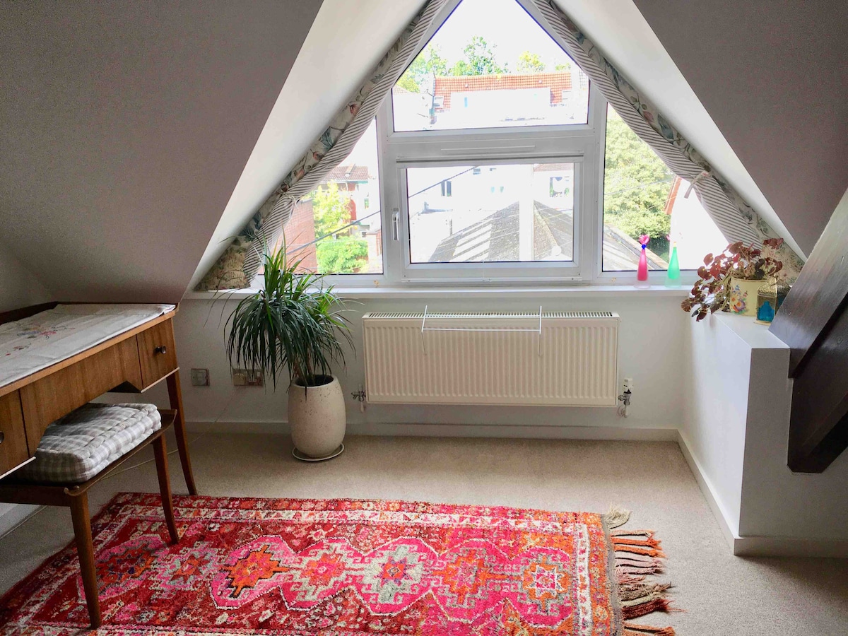 Atractivo alojamiento independiente en una pequeña calle arbolada y tranquila de casas familiares en el corazón de Clifton. A diferencia del resto de nuestra hermosa casa victoriana, tiene un toque contemporáneo ligero con 5 grandes ventanas Velux (con persianas opacas) que ofrecen magníficas vistas de Bristol. Nos gustaría enfatizar que, al ser una conversión de loft, en algunas áreas el techo es bajo y esto puede ser un pequeño problema, particularmente, para los huéspedes de más de 1,76 m (5 pies 10 pulgadas).