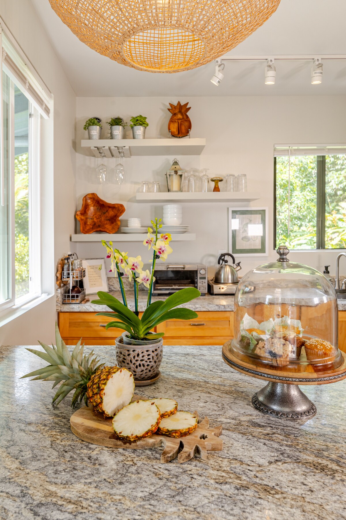 Nuestro pedazo de paraíso se encuentra en 1 acre de huerto tropical cuidado con más de 40 variedades de árboles frutales, un soporte gigante de bambú, cientos de orquídeas y hierbas. Casa de campo tipo estudio independiente de nueva construcción con cama tamaño queen con dosel y futón de tamaño completo supercómodo. Baño interior con ducha y ducha de bambú al aire libre. Cocina a estrenar y un adorable lanai para disfrutar de la vista panorámica del atardecer o del café por la mañana. Nuestro columpio de teca sobre la cabaña ofrece vistas al horizonte del océano.