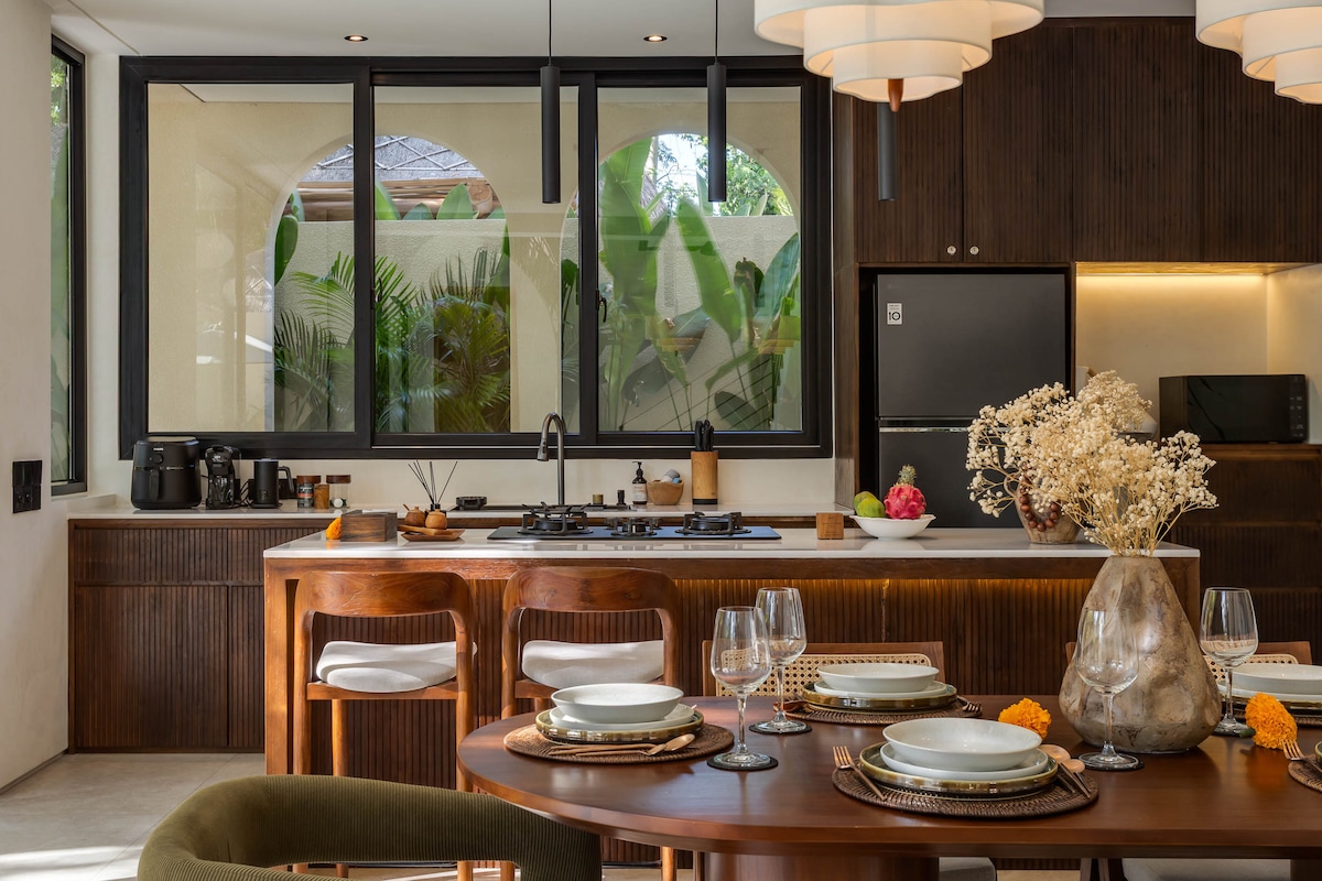 Villa moderna de 1 dormitorio con piscina privada en Ungasan: • Dormitorio elegante con iluminación de diseño y paredes de vidrio completo. • Baño privado con amenidades premium. • Piscina privada con luces brillantes y exuberante jardín tropical. • Rincón del salón con lámparas colgantes tejidas • Cocina y comedor totalmente equipados. - Wifi de 300 Mbps. • Limpieza diaria con toallas y sábanas frescas incluidas. • Netflix, PS5, comodidades para bebés a pedido • Conserje para alquiler de scooters, visitas guiadas y más • Se admiten mascotas • Depósito reembolsable de 500.000 IDR