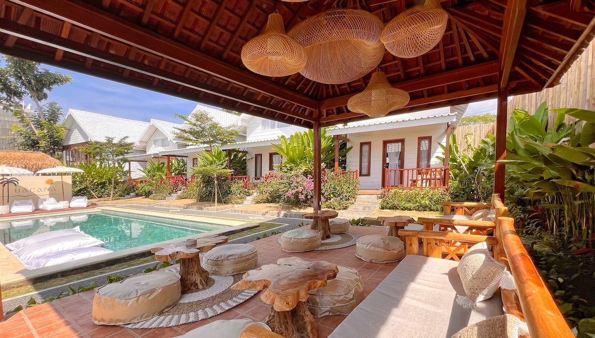 Eco-lodge, cree debut 2024 avec cuisine équipée et piscine privative dans un joli jardin. Avec sa toiture en alang - alang , sa salle de bain semie-ouverte , sa kitchenette independante, sa piscine et son filet de repos, le lodge offre des espaces ouverts sur le jardin tropical en toute privacy avec une decoration boheme qui vous plongera de suite dans lesprit de Bali. Petit déjeuner a la carte inclus 👍