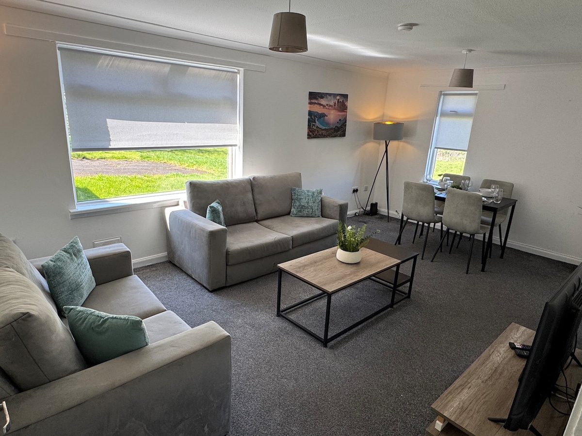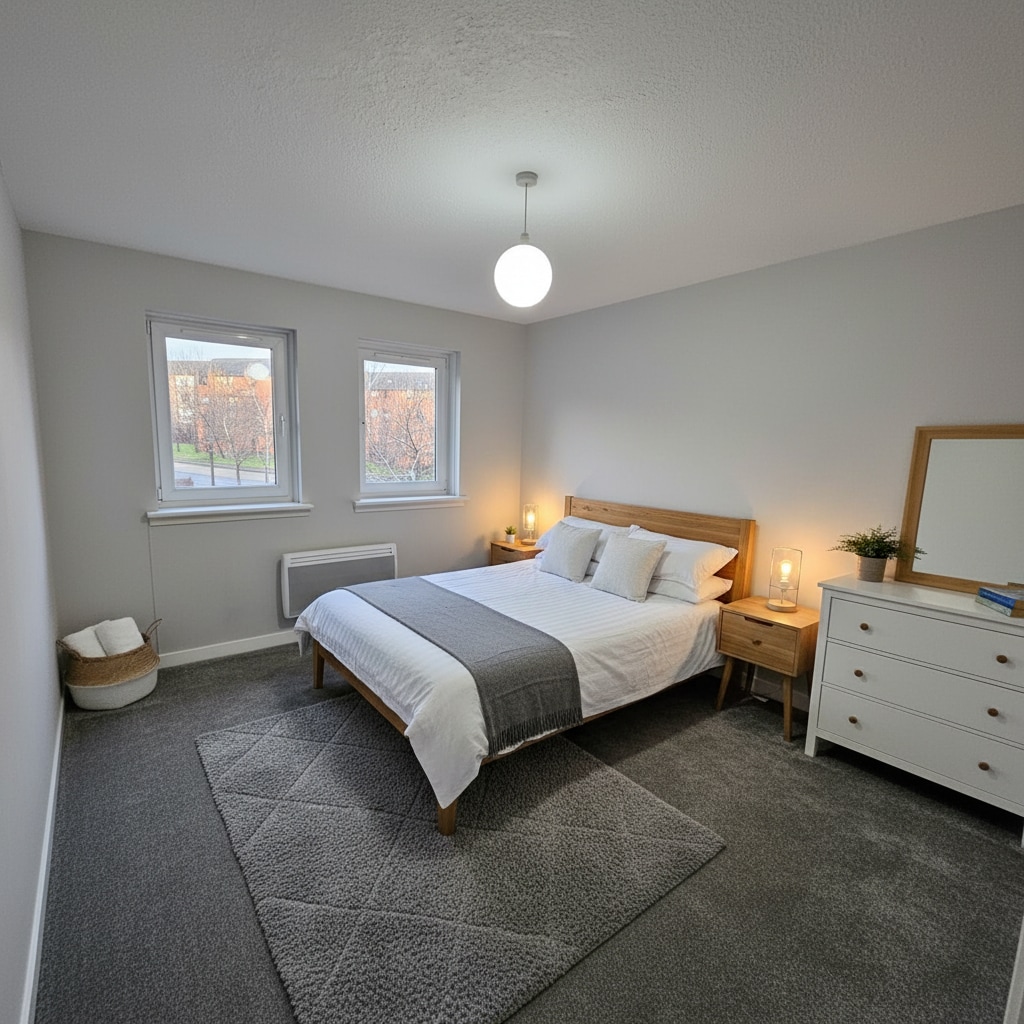 Apartamento de 2 dormitorios recientemente reformado, ideal para familias o viajeros solitarios. Disfruta de una luminosa sala de estar de planta abierta con una cocina moderna totalmente equipada y una acogedora calefacción por suelo radiante en todas partes. Ambos dormitorios dobles ofrecen cómodas camas para una estadía tranquila. Hay estacionamiento gratuito disponible justo afuera. A solo 10 minutos en auto del centro comercial East Kilbride, las estaciones de autobús y tren, y a 25 minutos del centro de la ciudad de Glasgow. El Hospital Hairmyres está a solo 15 minutos.