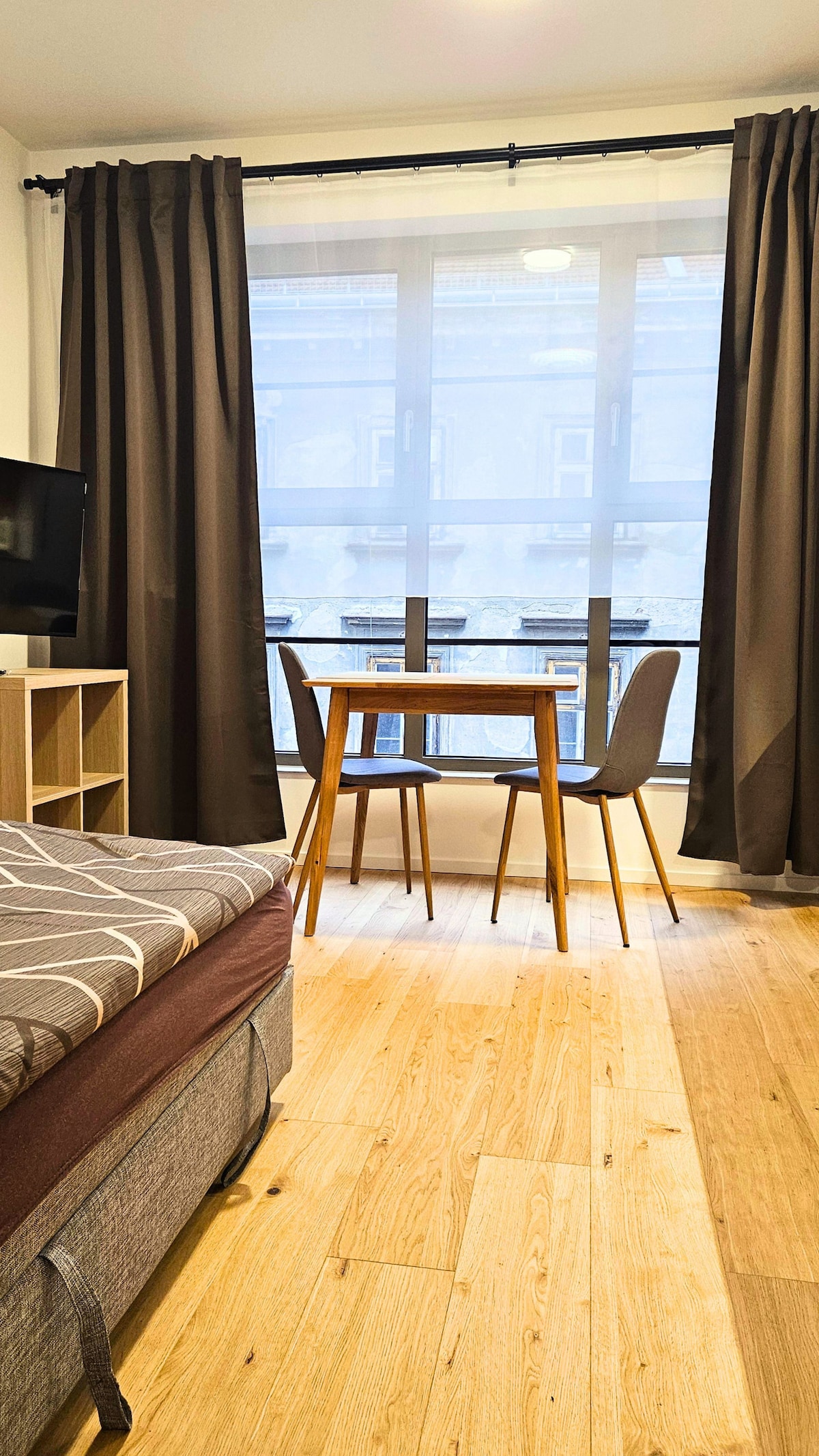 Este luminoso y confortable estudio de 30 m² ofrece un espacio ideal para la relajación y las estancias largas. Ubicado en una parte tranquila del edificio, con ventanas que dan al patio interior y un balcón privado donde podrás disfrutar de tu café por la mañana o relajarte por la noche. El estudio cuenta con una cama tamaño king (180 × 200 cm) y una cocina totalmente equipada, lo que te permite preparar tus comidas favoritas. Recomendamos encarecidamente este estudio a aquellos que buscan una estancia tranquila y cómoda con mucho espacio.