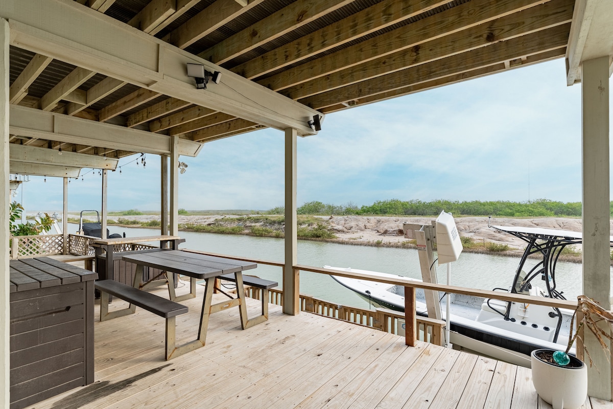 Relájate con toda la familia en este alojamiento tranquilo. Casa de campo frente al mar con acceso a SPI a través del canal intercoastal laguna Madre. Dos dormitorios, dos baños y medio ubicados en el rico centro vacacional de Long Island Village, a pocos minutos de las playas de South Padre Island. Puedes disfrutar de las vistas de las instalaciones de lanzamiento de SpaceX, pescar en tu muelle privado y ver los fuegos artificiales de verano en South Padre Island. *El elevador de barcos no está disponible para los huéspedes.