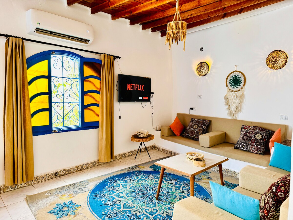 Esta villa única de estilo marroquí fue diseñada por mi esposa y por mí. Ambos somos artistas y todo el diseño de la casa, incluidos los muebles, es una obra de arte original. Lo diseñamos para dar la impresión de un hotel boutique y todo lo que hay en la casa está hecho en Dahab por artesanos profesionales. Esta es una experiencia única e innovadora que es enriquecedora pero que captura la estética de Dahab. La casa está a menos de un minuto a pie de la playa, así como de todo tipo de servicios.