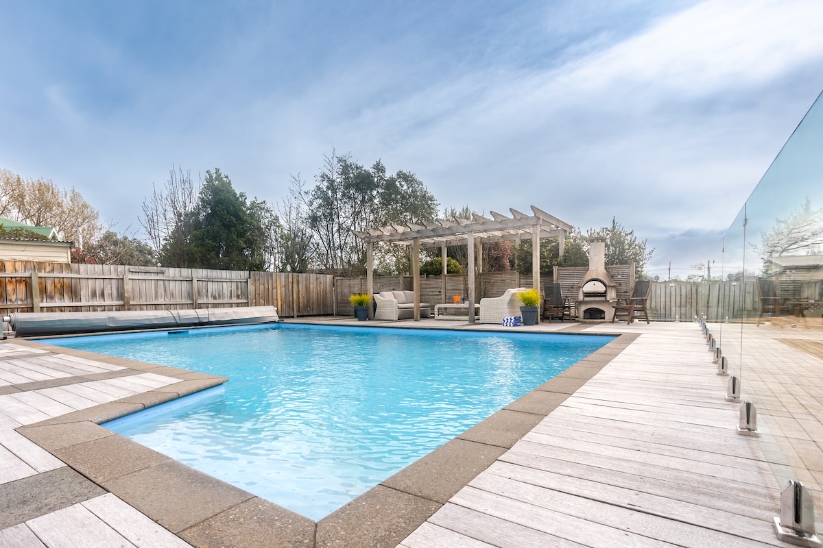 ¿Buscas una escapada relajante? No busques más, este refugio rural es perfecto. Situada a solo 10 minutos de Martinborough, encontrarás una moderna casa de 4 dormitorios con amplias vistas al campo. Diviértete nadando en la gran piscina climatizada al aire libre (disponible de noviembre a marzo) o relájate en los cómodos muebles de exterior. Disfruta de una cena al aire libre y saborea una copa de vino mientras contemplas las hermosas puestas de sol. Deléitate contemplando el magnífico cielo nocturno desde la gran piscina de hidromasaje.