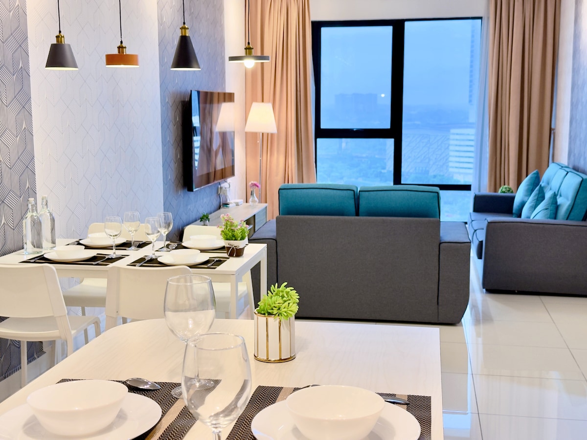 ¡Diseño de lujo y espaciosa unidad de 3 dormitorios con bañera! Camas tamaño king y Queen de primera calidad que garantizan tu buen sueño aquí con una vista increíble de Midvalley Mall y la ciudad de JB. ¡Tenemos TV inteligente equipada con aplicaciones de YouTube y Netflix! ¡También la máquina purificadora de agua que facilita tu estancia aquí! Rodeado de centro comercial y una gran variedad de sabrosas comidas locales. - A 2 minutos en coche de Midvalley Southkey JB - A 5 minutos del centro comercial KSL City Mall. - A 8 minutos del centro comercial City Square y Custom JB.