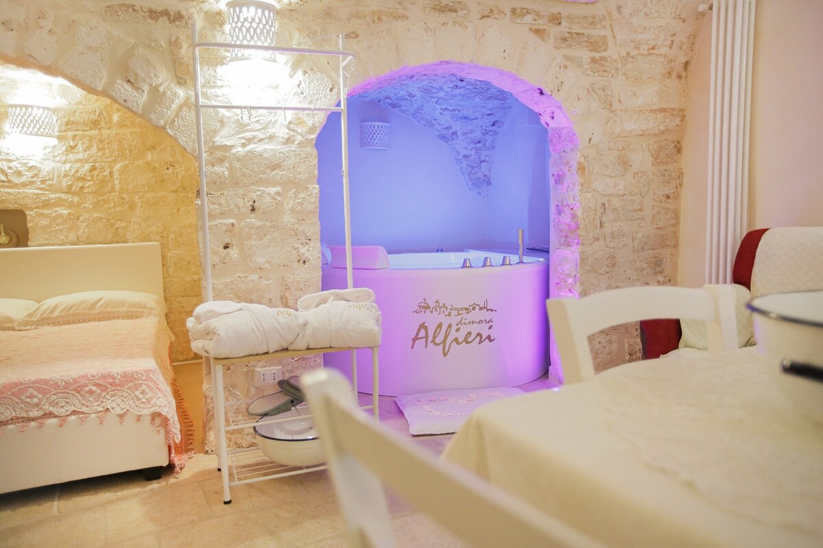 Decorado con estilo respetando las características de los «trulli», alojamiento equipado con aire acondicionado y calefacción, con la posibilidad de usar la cocina equipada con vajilla, nevera, TV en todas las habitaciones, con cenador exterior donde podrás relajarte y disfrutar de la belleza del lugar, sofá cama con la posibilidad de añadir bajo petición una cuarta cama gratis. Baño de piedra típica equipado con ducha, inodoro, lavabo y accesorios: secador de pelo, ropa de cama, toallas y juego de baño.