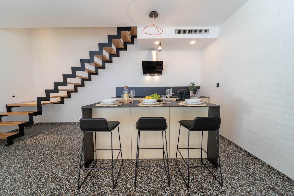 Sumérgete en el ambiente tranquilo de este dúplex ecléctico de diseño elegante. A lo largo del apartamento, descubre una mezcla armoniosa de texturas y patrones contrastantes, acentuados por vibrantes toques de color y elegantes puertas francesas de vidrio que conducen al exterior. Después de explorar el animado centro de la ciudad de Split, relájate en la terraza con bebidas refrescantes. Experimenta lo mejor de ambos mundos: la comodidad y conveniencia de un hotel junto con la privacidad y comodidad de un hogar.