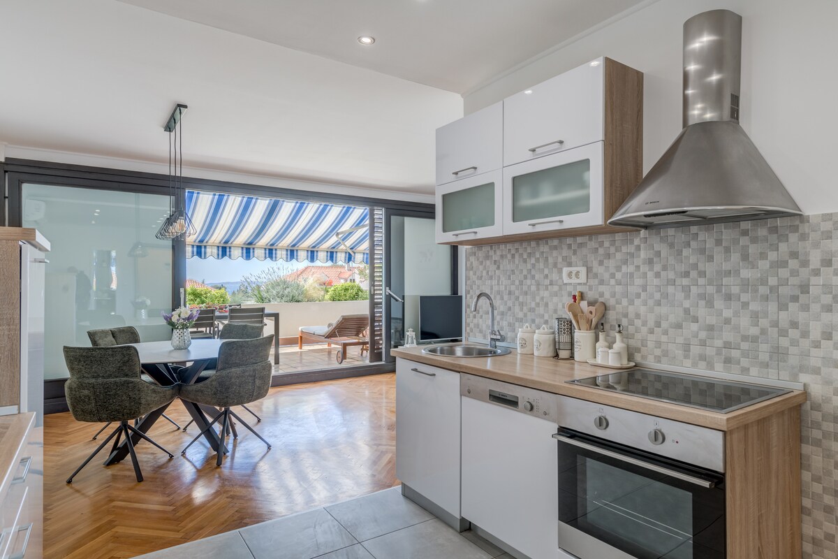 Royal es un apartamento nuevo, moderno y lujosamente renovado con jacuzzi, a 50 metros de la playa. Tiene 50 metros cuadrados y una terraza de 30 metros cuadrados. Cuenta con 2 dormitorios, sala de estar, cocina totalmente equipada con comedor, baño con gran ducha, barbacoa, garaje (1 coche), TV de pantalla plana en todas las habitaciones y wifi gratuito. Ofrece una gran terraza con vistas al mar abierto y a las islas circundantes. Se puede disfrutar del buceo cerca. Trogir está a 5 km y el aeropuerto de Split a 8 km del alojamiento.