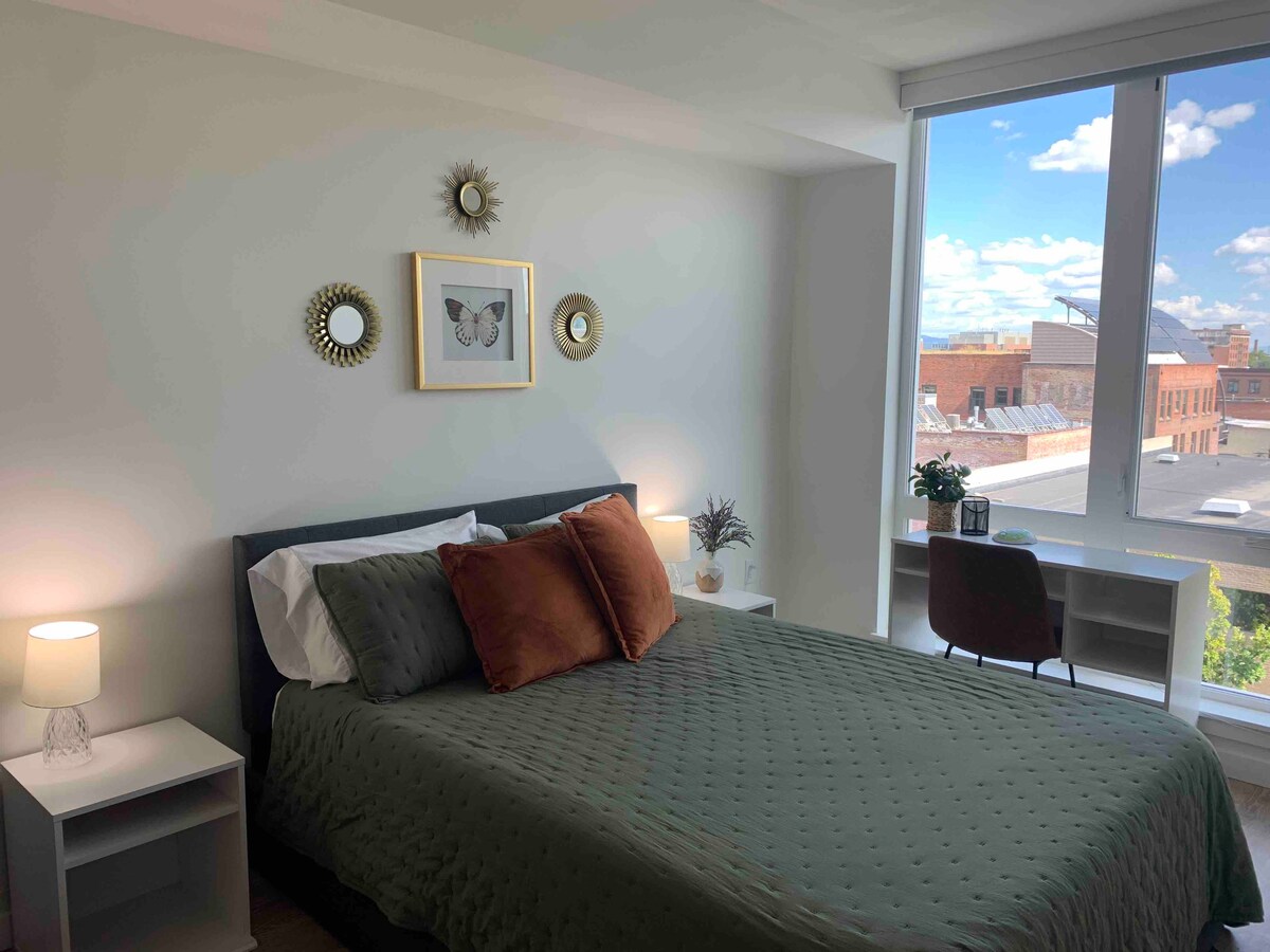 Descubre el lujo urbano en este apartamento industrial-chic. Estacionamiento cerrado seguro para 1 coche, acceso al ascensor y gimnasio a pocos pasos. Relájate en el balcón privado con vistas al puente del tren o disfruta de interiores elegantes. Dos amplios dormitorios cuentan con vestidores, que ofrecen comodidad y conveniencia. Duerme profundamente en camas tamaño king y queen, además de un sofá cama tamaño queen con un colchón de espuma viscoelástica de 4 pulgadas. Las instalaciones de lavandería se encuentran en la unidad. Cervecería y restaurante justo al salir por la puerta principal