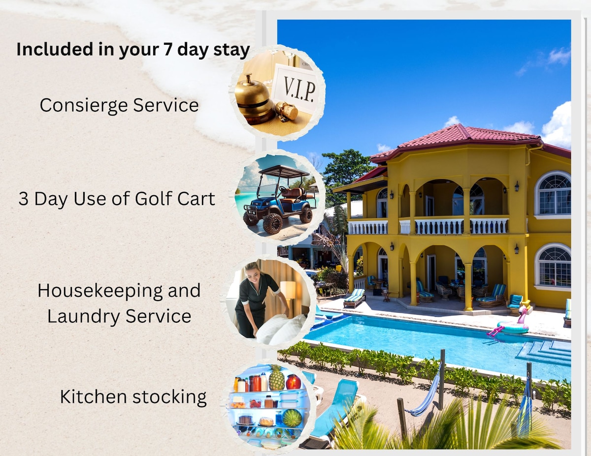Luxury beachfront home with a gorgeous white sandy beach! The house has 2 beautiful air conditioned units included together, ideal for those traveling with another couple, teenagers, extended family, or anyone that would benefit from a little extra privacy. Perfect location in an exclusive neighborhood close to downtown. Also includes a FREE GOLF CART with refundable security deposit. We are Gold Standard Certified.