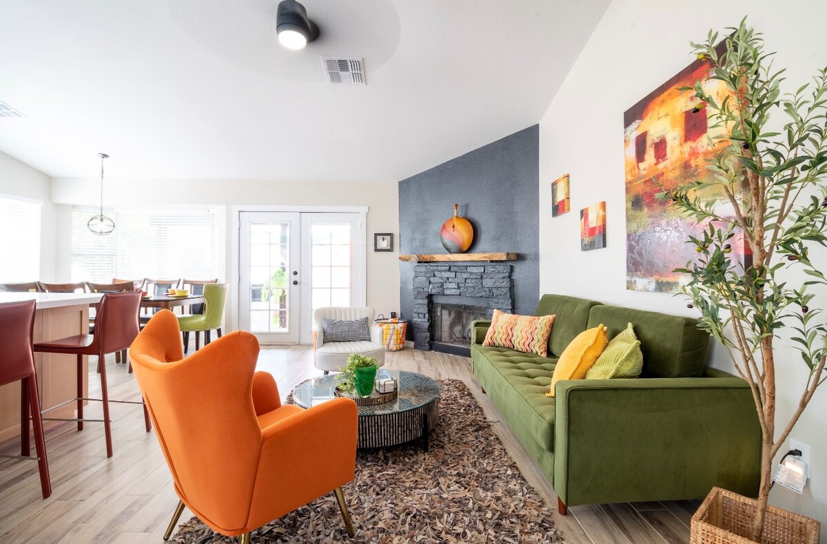Bienvenido a la casa artesanal en el desierto. Hay una gran zona al aire libre con piscina climatizada, barbacoa y mesa de fuego de propano. La calefacción de la piscina está incluida en el coste de tu estancia de octubre a mayo. Disfrutarás de entretenimiento en la cocina de chef totalmente equipada con electrodomésticos actualizados y una freidora de aire en el horno. Las cómodas camas son de espuma viscoelástica y los baños están actualizados. Evita el tráfico del día del partido/concierto y opta por un paseo fácil. Estamos ubicados a 0,8 millas del estadio State Farm.
