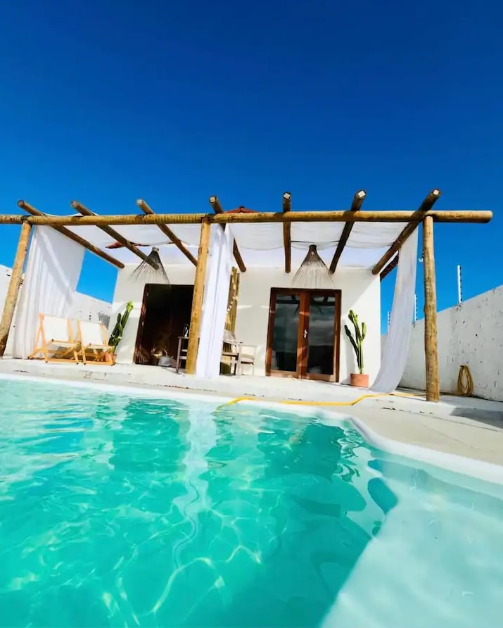 Nuestro espacio está formado por 5 bungalows privados, cada uno con su propia piscina, dos baños en suite, cocina completa y zona al aire libre, preparados para alojar a 5 personas cómodamente, ubicadas cerca del famoso túnel verde y a 350 metros a pie de la playa de Patacho en Porto de Pedras - AL. Una cesta de desayuno se entrega todos los días en el bungalow y proporcionamos bicicletas y artículos para llevar a la playa. Diviértete con toda la familia en una de las playas más bonitas de Brasil.