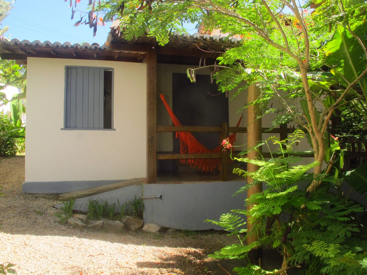 Estou na Travessa dos Hibiscus a 650 m do centro. Chalés amplos tipo estúdio, cama e cozinha num espaço só (utensílios básicos, tenho mais se necessário), banheiro privado. Colchão de casal molas ensacadas. Pátio com mesa, cadeiras e rede. Jardim arborizado e estacionamento interno. Forneço roupa de cama e banho que troco semanalmente. Ar-condicionado! Tenho Wi-Fi 5G e 2G. Não tenho TV. Gatos presentes no jardim. Os timbus, vivem na propriedade e eliminam a animais peçonhentos. Não portam raiva