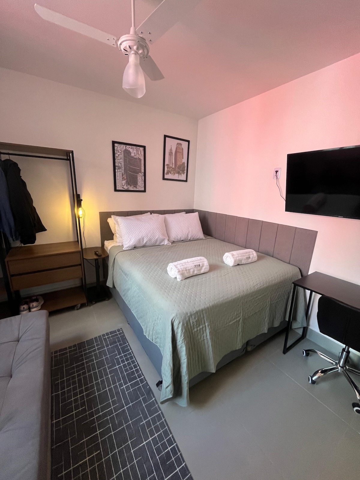 Cine, bañera y cama tamaño king en un apartamento en el centro de SP
