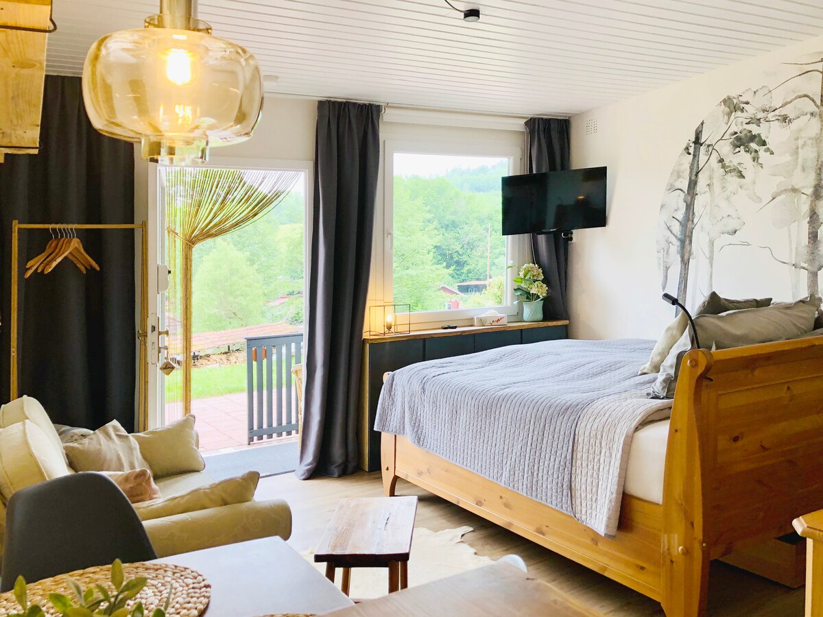 Ein Gästehäuschen (ca. 20 qm) zum Verlieben im Alten Forstamt Sinntal. (Alternativ 50 qm/ 3 Personen: NEU FeWo Altes Forstamt Sinntal) Wertige Ausstattung mit Fußbodenheizung, Taschenfederkernmatr. + liebevollen Details, wie z.B. indir. Beleuchtung, schaffen ein absolutes Wohlfühlklima Eig. Garten mit Terasse + Grill. Traumh. Aussichtspkte in Rhön + Spessart 1 Haustier willk Schöne Thermen + Skigebiete in Umgebg Top-Radwegenetz, z.B. Rhönexpr.Bahnradweg, R2 Naturbad, Wandern, Fliegenfischen
