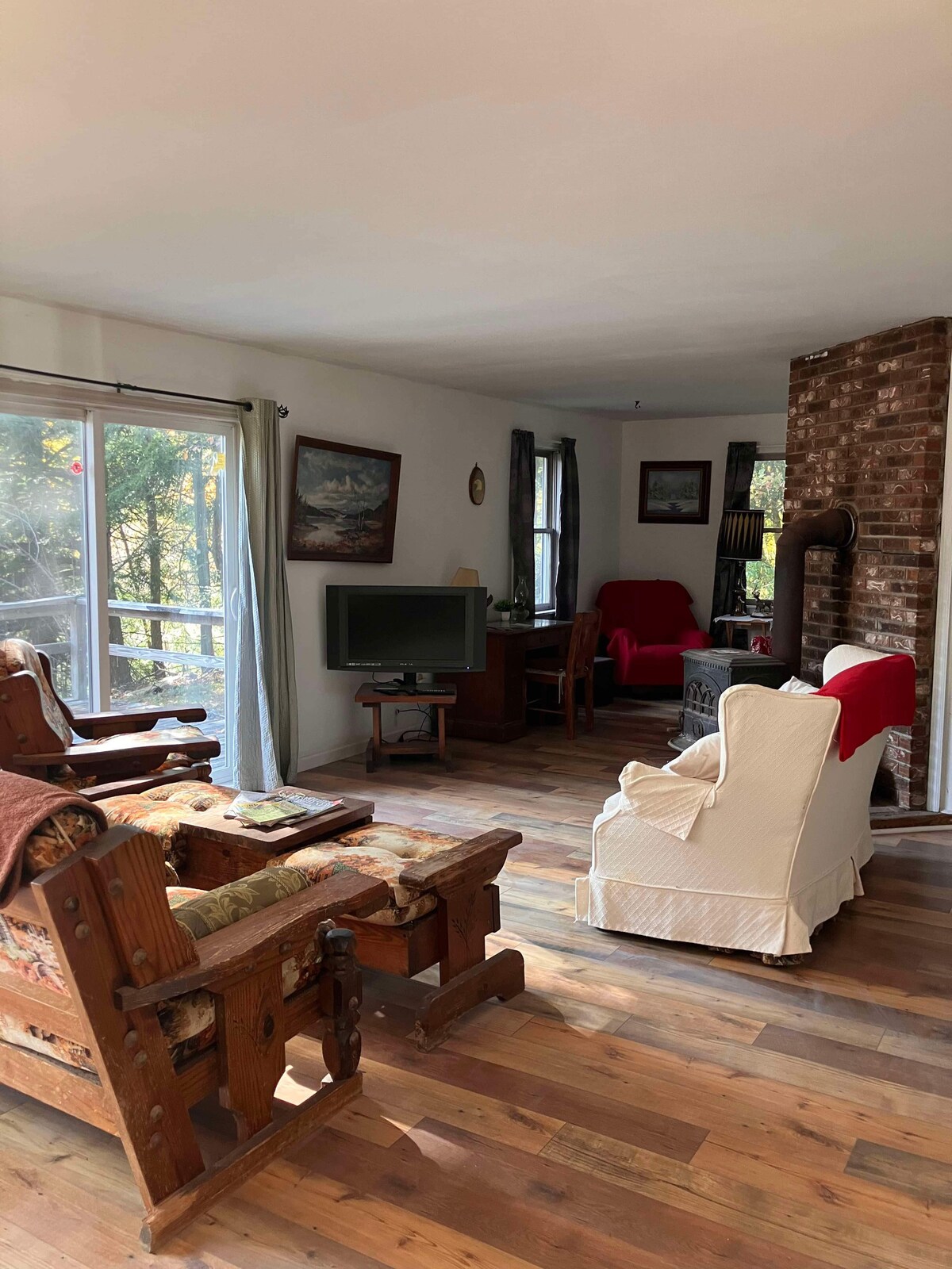 Una linda y acogedora cabaña tiene capacidad para 4 personas cómodamente. Una cama tamaño queen y 1 sofá cama. Se admiten perros para un máximo de 2 perros a $100 por perro. Mi casa de campo se encuentra en 13 acres privados. Parcialmente cercado a 3 millas por la carretera del centro de esquí Jiminy Peak y actividades de verano y a poca distancia en auto del parque de aventuras Ramblewild. Senderismo, paseos en barco, museos, tiendas, restaurantes, todo tipo de actividades en los Berkshires. ¡A dos minutos en auto de Bloom Meadows!