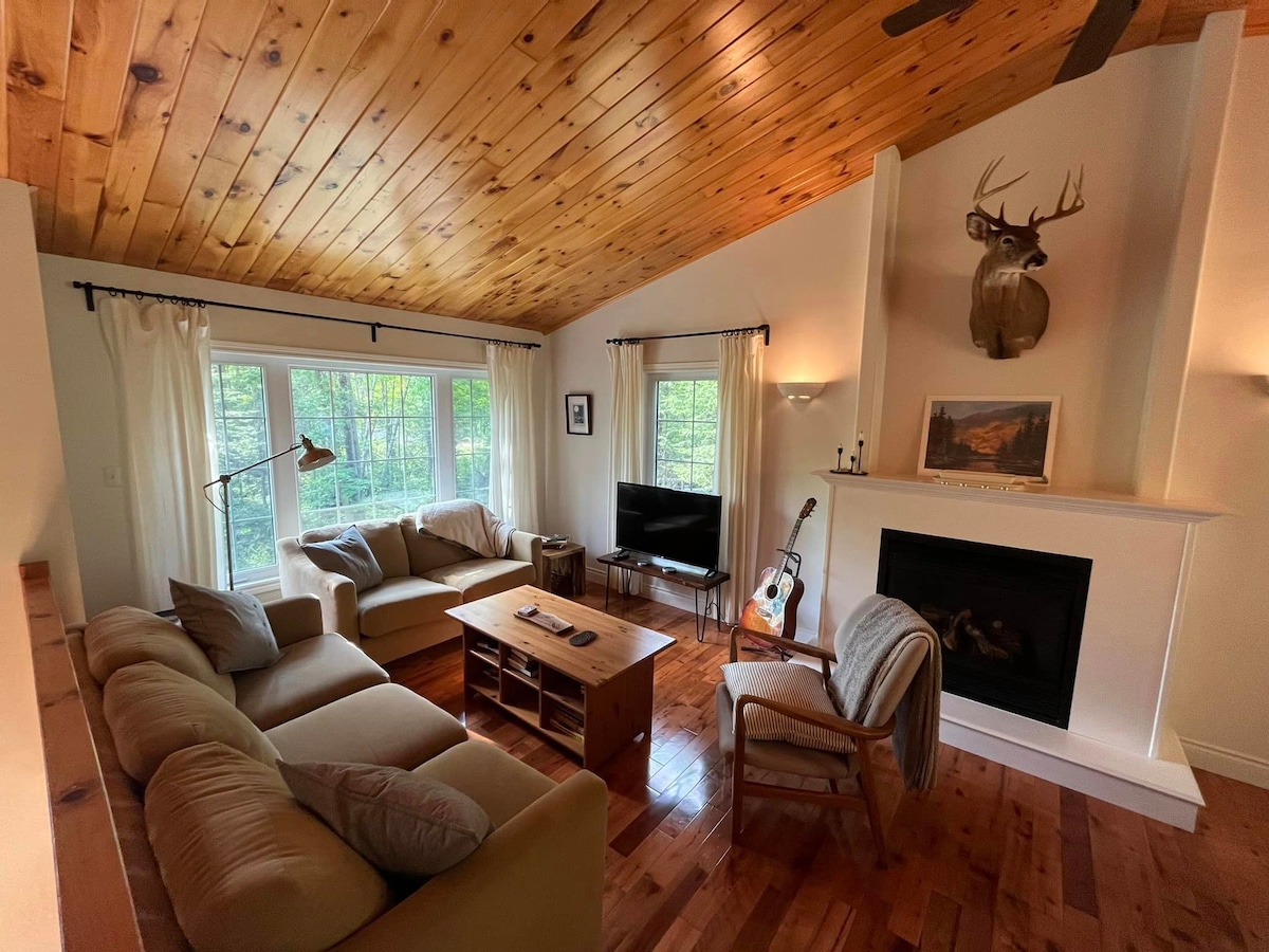 Escapa del caos diario y relájate en esta romántica casa con estructura de madera. Ubicada en 36 acres de bosque y pantano, esta encantadora escapada cumplirá el deseo de cualquier pareja de un fin de semana privado en el bosque para disfrutar de una profunda conexión entre sí y con la naturaleza. Los techos altos del loft, las vigas a la vista, la chimenea de leña, un acogedor dormitorio tipo loft, una espaciosa ducha para dos y una bañera profunda crean un ambiente íntimo y agradable para tu retiro sin preocupaciones. Alberga una gran cantidad de vida silvestre.