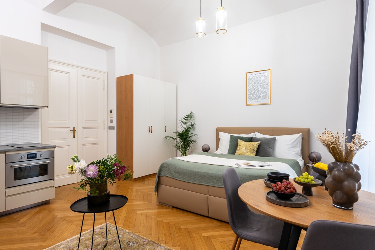 A new, luxury, one bedroom apartment in recently renovated historical building in the old center of Prague. The apt. has very modern interior combined with classic wooden elements. There's a quiet bedroom with double bed and a high quality mattress, a fully equipped kitchen, a comfortable living room with a sofa bed and a separate bathroom. Fast internet. The apt. is perfect for two but it comfortably hosts up to four guests. The building has 24/7 receptionist and security on duty.