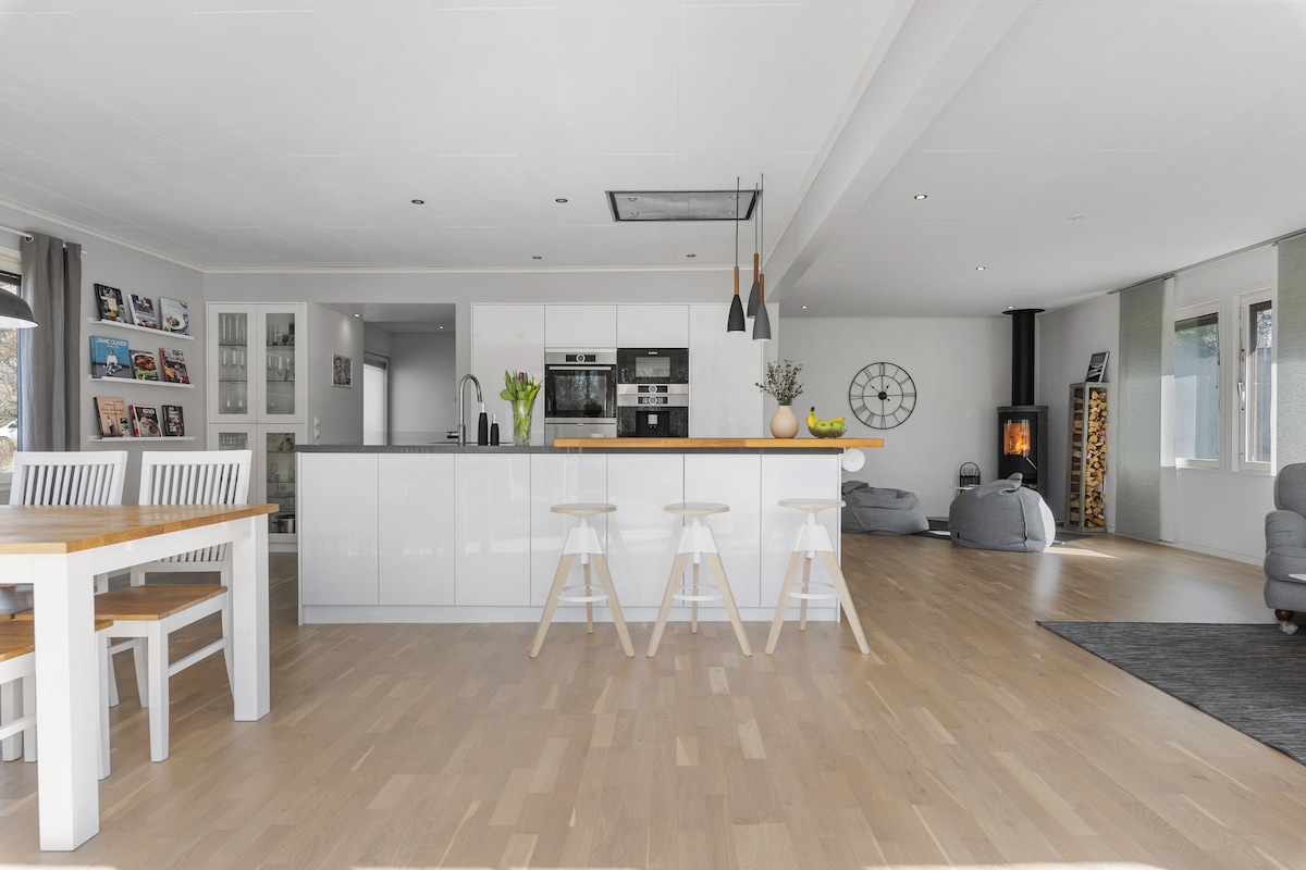 Villa grande con decoración moderna, 4 dormitorios (3 con cama doble, 1 con cama individual). La casa está totalmente amueblada y la cocina totalmente equipada. Cerca del centro de la ciudad de Gotemburgo (10 minutos en coche, 25 minutos en autobús/tren). Baño grande en la planta baja con ducha doble, sauna y bañera. Amplia terraza con zona de estar y parrilla, así como zona de césped para juegos y juegos en el jardín. Reglas DE reservación: solo las familias atentas y los adultos mayores de 28 años pueden reservar debido a daños anteriores y fiestas sin limpieza.