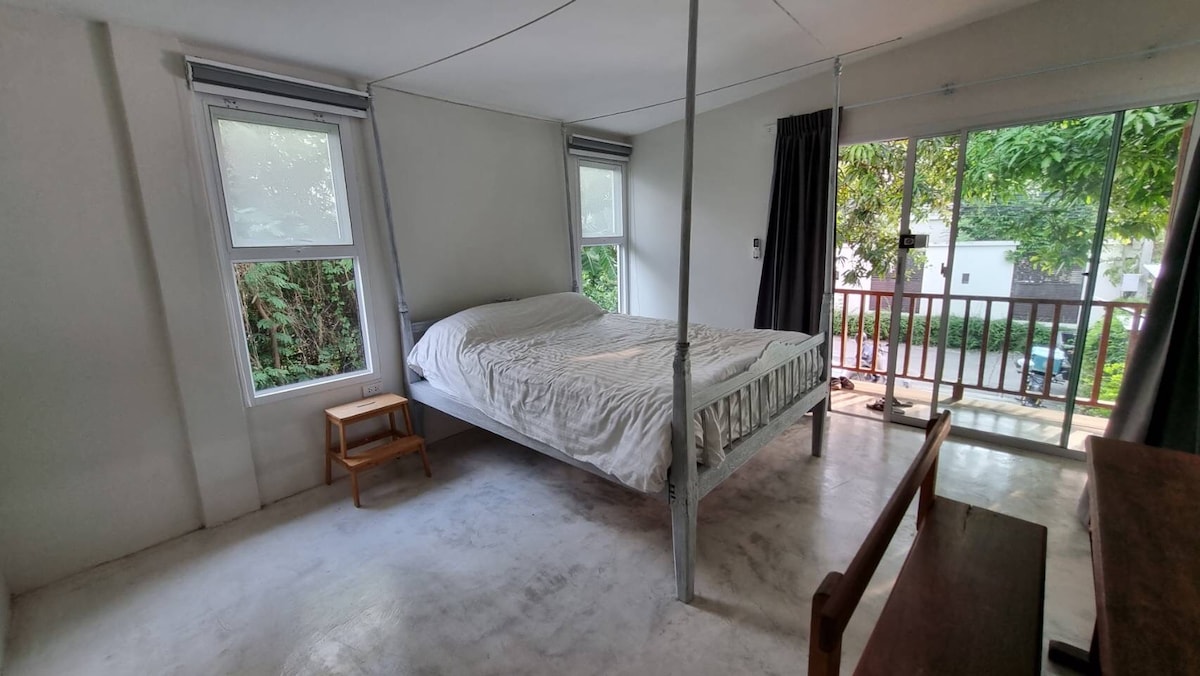 Loft urbano con ventanas de doble altura y cálido diseño industrial **Nota** ❗️El departamento está ubicado en el cuarto piso ❗️No hay ascensor ❗️La ubicación no está en el centro de la ciudad: el departamento está más cerca del aeropuerto de BKK (Suvarnabhumi) ✨ LO más destacable • Cama tamaño king de 6 pies en el nivel del entrepiso. • Ventanas grandes con luz natural. • Baño privado • Cocina pequeña totalmente equipada (fregadero, microondas, platos, nevera). • 2 unidades de aire acondicionado. • Mesa alta + taburetes de bar para cenar o trabajar con computadora portátil