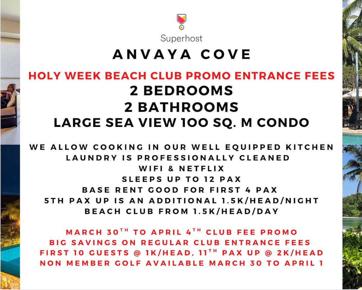 I’m a Superhost with 700+ reviews ✓ We live at Anvaya ensuring your stay is seamless ★ Super clean unit with professional laundry ★ Cooking Allowed ★ WiFi/Netflix ★ Base rate good for up to 4 pax ★ Additional pax @ 1.5k/head/night ★ Beach Club entry from 1.5k/head/day - only paid on days you actually enter the club ★ Beach Club now managed directly by Ayala Hospitality ★ New Head Chef who trained at Enderun ★ Makes a great base to also explore Zoobic Safari, Ocean Adventure & Las Casas Filipinas
