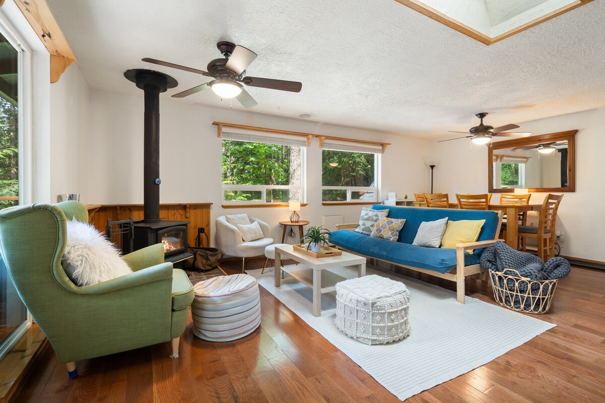 Unwind at this stylish and serene woodland retreat—your perfect basecamp for adventure or relaxation. Nestled in a peaceful forest setting, it's just steps from a scenic nature preserve trail and close to miles of hiking and mountain biking. After a day of exploring, kick back in comfort and take in the quiet surroundings. In winter, hit the slopes at Mt. Baker or cross the border for a ski day at Cypress Mountain. A cozy, modern escape with year-round access to the best of the outdoors.