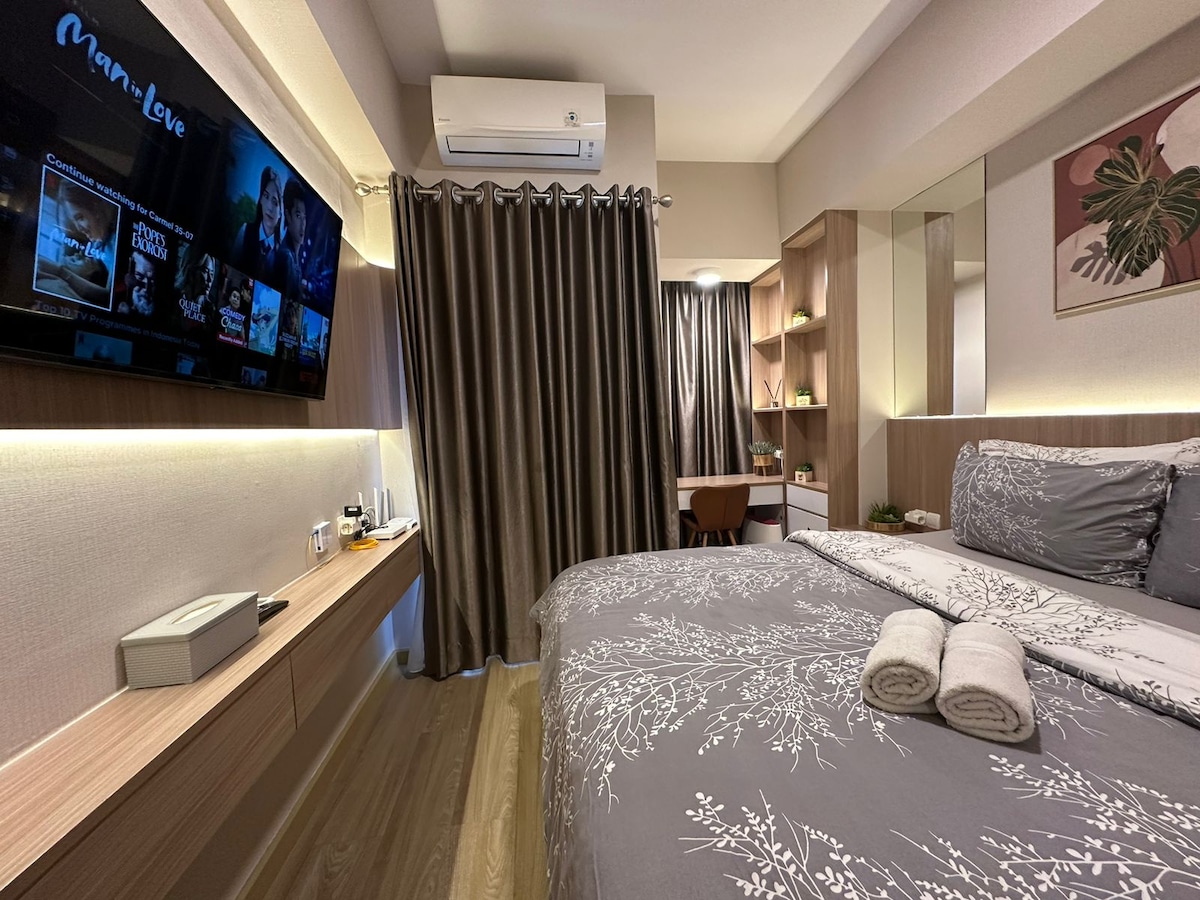 Interior NUEVO Y moderno, equipado con suelo de madera de vinilo y cálidas luces colgantes. La unidad está equipada con un sofá, TV ANDROID INTELIGENTE de 40 pulgadas, escritorio y regleta inteligente, su propio baño, una cama tamaño queen, un espacioso armario y un balcón con vistas a la ciudad. También se proporcionan utensilios básicos de cocina para cocinar LIGERAMENTE. La unidad también está rodeada de un montón de instalaciones para una mejor calidad de vida (piscina, jardín temático, parque infantil y acceso al puente elevado al centro comercial SMS).