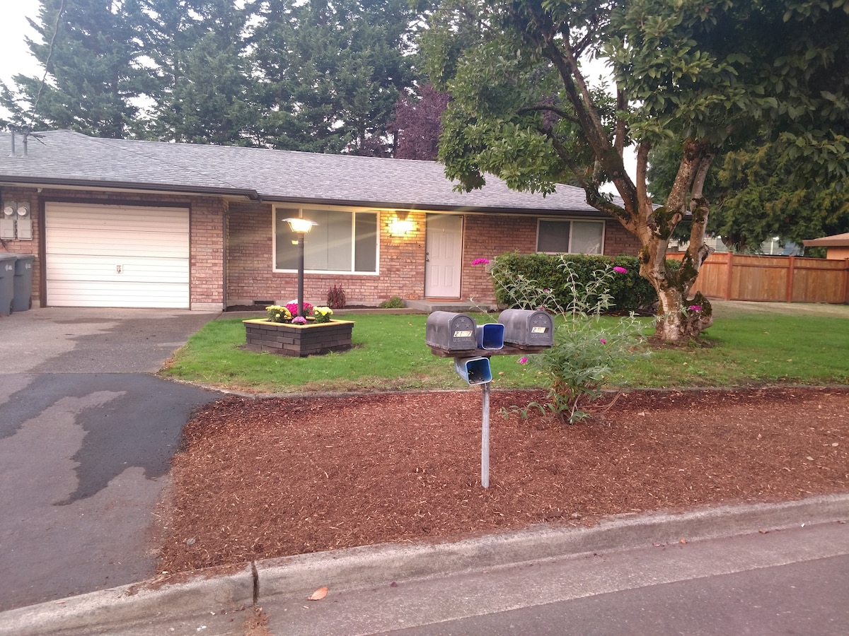 Enjoy Peaceful & quiet, yet centrally located! - 5 minutes away from the Washington State fair, major highways. - 15 minutes to Tacoma Waterfront & restaurants. - 30 min drive to SEA-TAC Airport -NURSES: Good Samaritan-Puyallup 5 min away. Saint Joseph-Tacoma 15 min Away. Tacoma General 20 min. - 5 min. to Sounder Train Station and parking garage. - 2 bedrooms (1 Queen ben, 1 Full Bed) - Full Kitchen - complete dining set and cookware - Wi-Fi - Washer & Dryer - Private Backyard – Fully Fenced