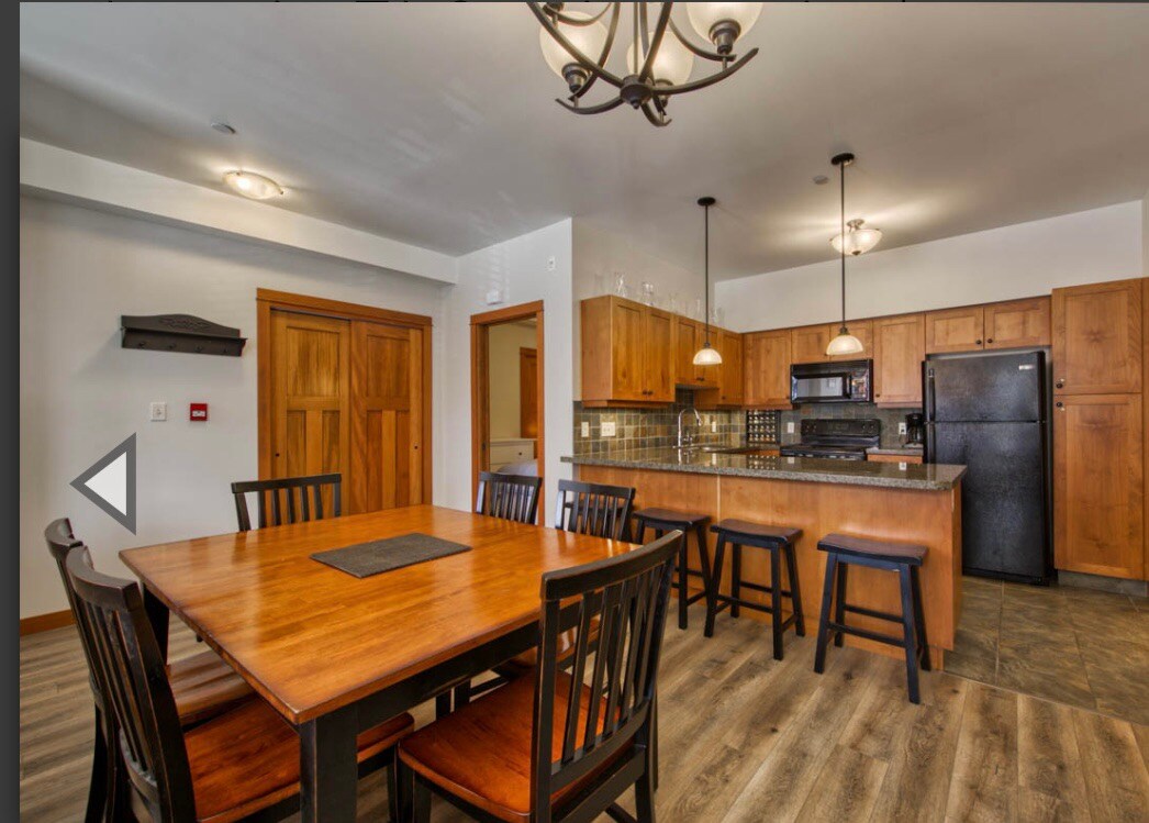 New, modern condo in a prime location with excellent ski-in/ski-out access via the Morrisey and Orient chairlifts! This unit is perfect for a small family getaway or 2 couples. It is a cozy 2-bedroom condo with a full kitchen, dining area, and living room. There are 2 bathrooms, a washer/dryer, gas fireplace, flatscreen TV, complimentary Wireless Internet, and a private hot tub! The condo has a king bed, twin over queen bunk bed , and a double fold-out sofa bed. No smoking and no pets.
